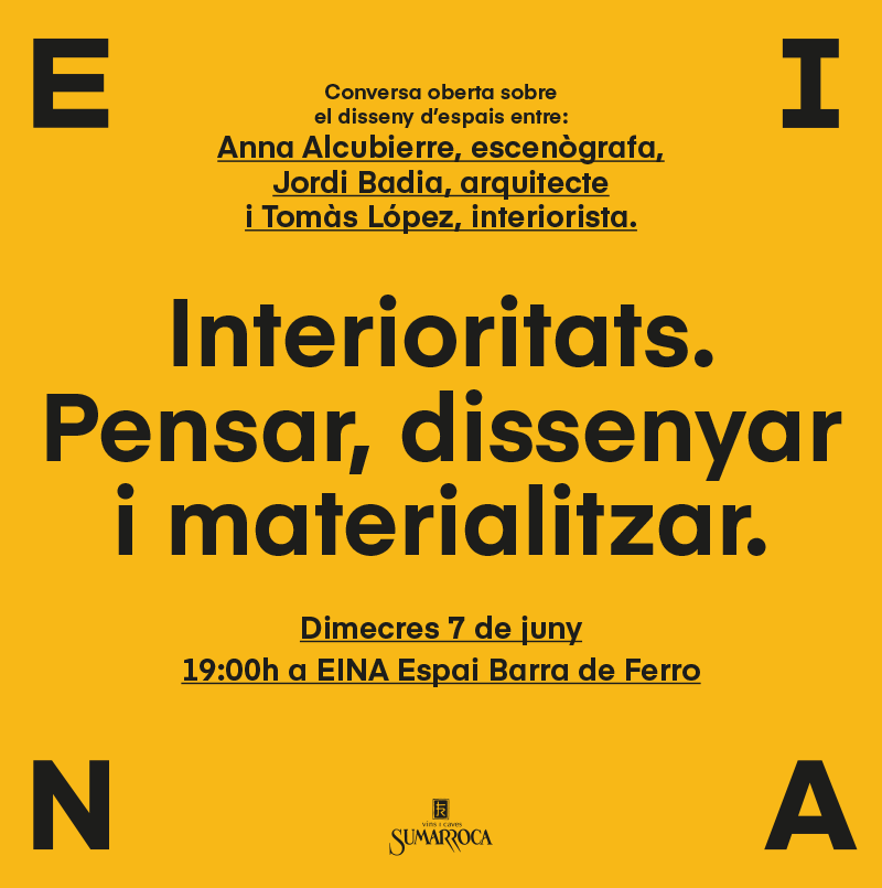 Within the framework of the Master in Interior Design, there will be an open talk "Interiors. Think, design, and materialise" with Anna Alcubierre, set designer and teacher at EINA, Jordi Badia, architect, and Tomàs López, interior designer, former student and former professor at EINA. The session will have the reflexion on the interior design process from three different areas...
