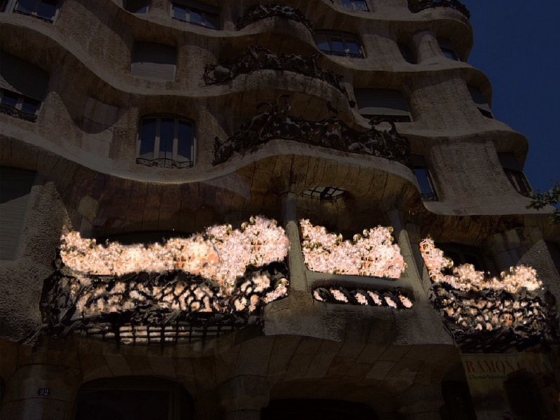 Damià Araujo, Pia Callís, Jordi Farriol, Luis Gimeno and Miriam Rodergas, students on the Design of Ephemeral Spaces subject, in the 2nd year of the Bachelor's Degree in Design, led by Judit Colomer and Octavi Rofes, have been commissioned to design the Christmas decoration of the façade of the Casa Milà, popularly known as La Pedrera. The installation is a volumetric representation where the three-dimensional and deconstructed vision of the traditional Christmas tree reflects the end of the year and family celebrations.