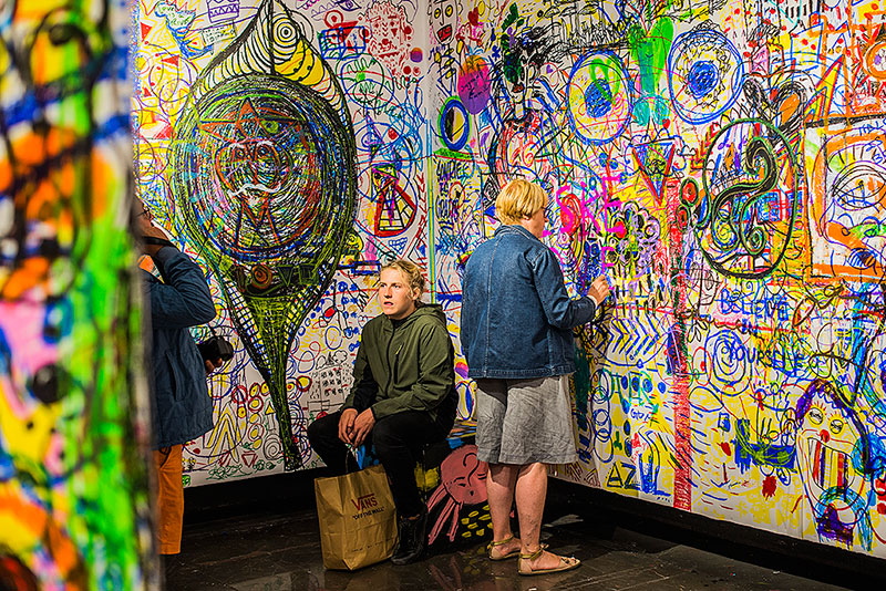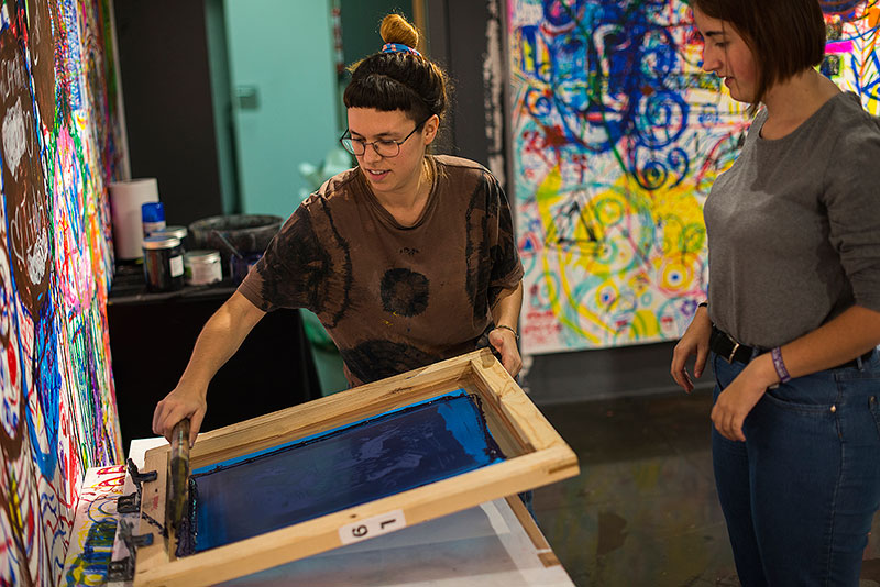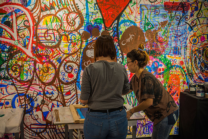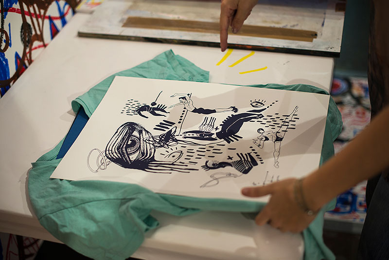 Under the coordination of Esther Aguilà, workshop leader, an image was created among four people so that visitors to the workshop could take an active part in the action, silk-screen printing it on the support that they brought along. With participants of all ages, most of them had not had contact with the technique before, which made them enter into it fully, with all that that entails: failures and successes, in equal parts, in the stamping process.