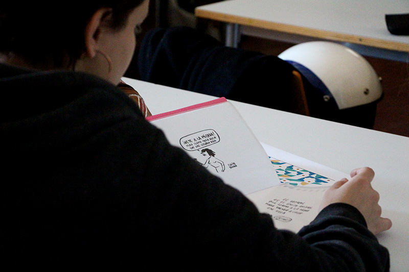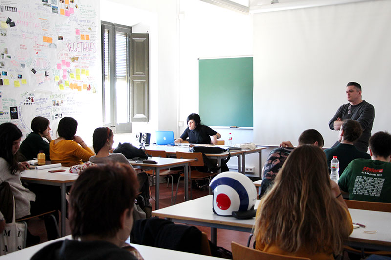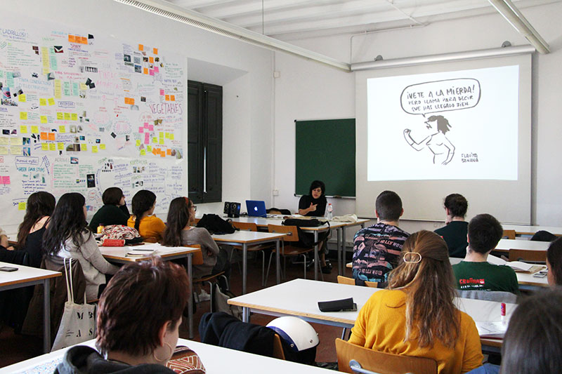 The students of the fourth year of the Degree in Design, in the applied illustration course, impartida per Jordi Duró, have been visited by the illustrator Flavita Banana. She has talked about her work process, how she manages the public's feedback or the limits of humour, which from her point of view, it's not anything in particular but the context and the public that gets her illustsrations.