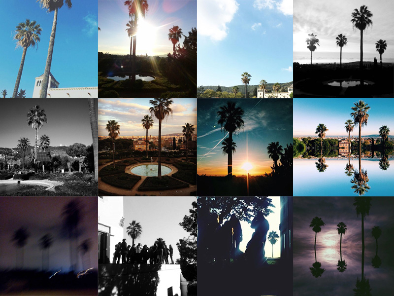 Through Instagram, tagged as @einabcn (EINA account) we have found numerous palm images, sunsets and sunrises in-between palms, palm trees in the background of classroom windows, palm shots from the library, the garden, etc.