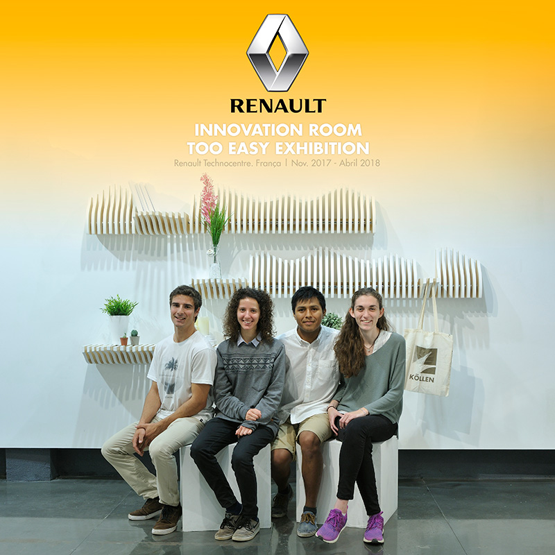 The Köllen Design group, comprised of Oriol Campillo, Núria Jané, Adrián Soldado and Paula Terra, 4th-year students on the Bachelor’s Degree in Design, will be taking part until April 2018 in the Too Easy innovation exhibition, as part of the Innovation Room, a special exhibition that the Renault group is staging in the Renault Technocentre, an exhibition venue that contributes to developing innovation and creativity, seeking to be a source of inspiration and opening.