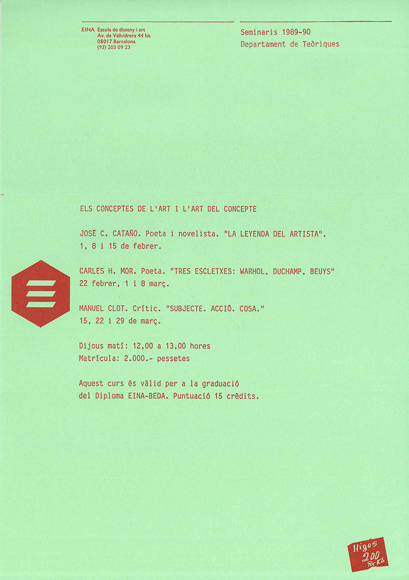 This last February, the art critic Manel Clot has left us. Linked to EINA since 1989, Manel Clot taught various courses. Between 1992 and 2000 he took charge of the course Contemporary Art and from 2001 to 2011, Art Trends, both subjects in the Bachelor of Design. He also coordinated the exhibition Postgraduate Genres: processes and formats for the three editions that took place from 2000 to 2003. His long collaboration, despite the difficulties at times due to his fragile health, represented a rigorous educational work done with enthusiasm. Colleagues who shared with him those years and that enjoyed and celebrated his classes, will remember him.