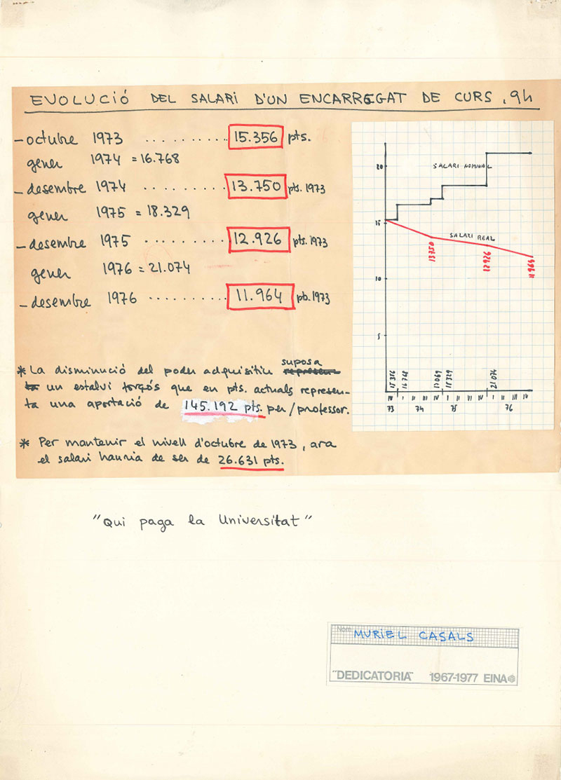 Muriel Casals was linked to EINA during the first stage of the center. Specifically, as reflected in our archive, she imparted during the year 1973-1974 the economics seminar "Notes on economic politics on consumerism". Through these seminars and courses EINA called upon valuable young professors of different disciplines to enrich and assist in the contents of its education programs.