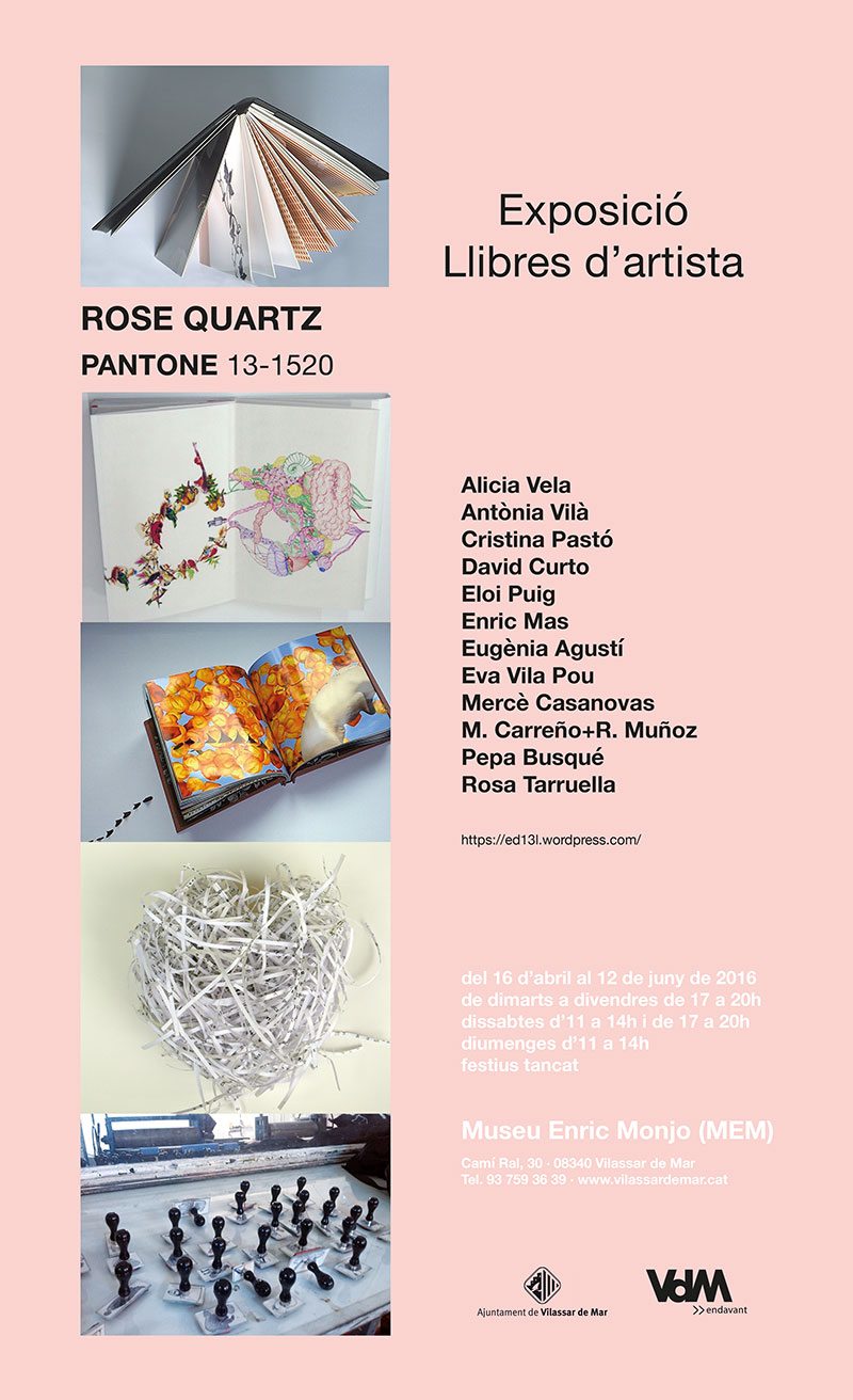 Until June 12th, you may visit the exhibition of artists’ books "ROSE QUARTZ - PANTONE 13 -1520". Participants include Enric Mas, professor of the degree in design, Antònia Vilà, former professor and member of EINA’s Foundation Board of Trustees and Rosa Tarruella, Cristina Pastó and Eugènia Agustí, also former professors of EINA, all of them members of 13L, artists’ collective of Barcelona, that elaborates projects related to artists’ books or bookworks.