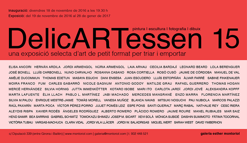 On November 18th DelicARTessen 15, will be opened, an exhibition a painting, sculpture, photography and small form format drawing exhibition in which Mar Saiz, professor in the Bachelor’s degree in Design and Manel Rubiales, professor in the Postgraduate course in creative illustration and visual communication techniques. You also will be able to see Nicole Gagnum’s work, former professor at EINA and that of former students, such as Dani Ensesa, Marta Lafuente, Maracos Palazzi o Xavier Rodés.