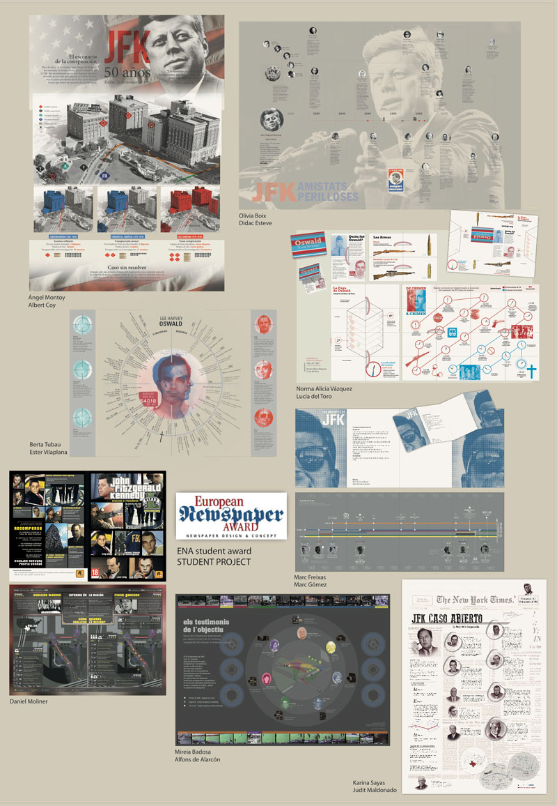 2013-2014 Students Mireia Badosa, Olivia Boix, Albert Coy, Alfons de Alarcón, Lucía del Toro, Dídac Esteve, Marc Freixas, Marc Gómez, Judit Maldonado, Dani Moliner, Ángel Montoy, Karina Sayas, Berta Tubau, Norma Alicia Vázquez and Ester Vilaplana, of the subject [Infografia](http://www.eina.cat/ca/grau-de-disseny/assignatures/infografia http://www.eina.cat/ca/grau-de-disseny/assignatures/infografia )) fourth year of EINA’s Bachelor Degree in Design, taught by [Jordi Català](http://www.eina.cat/ca/eina/professorat/jordi-catala http://www.eina.cat/ca/eina/professorat/jordi-catala ) have won a European Newspaper Award, awarded by the Office for Newspaper Design, for the informative and visual qualities of an infographic project on John F. Kennedy. The European Newspaper Award, which recognizes the best work release in the continent under 21 different categories was awarded to the collective group of students, in the category of visual journalism students / information design.