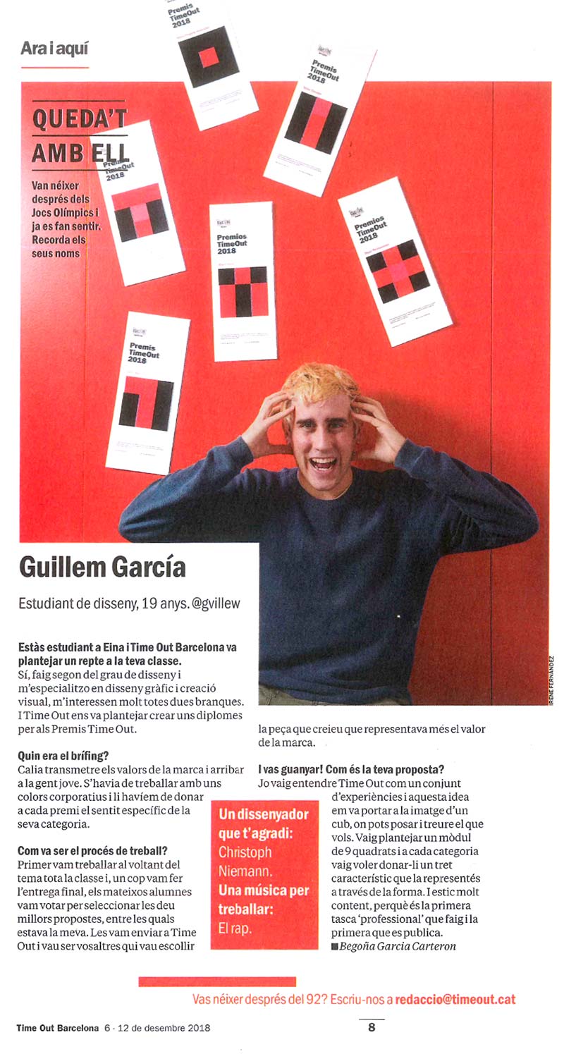 On Graphic Design Projects 1, a subject in the 2nd year of the Bachelor’s Degree in Design, led by Pilar Górriz, a collaboration project with the [TimeOut] magazine (https://www.timeout.cat) has been produced for the design of the TimeOut 2018 Awards diploma.