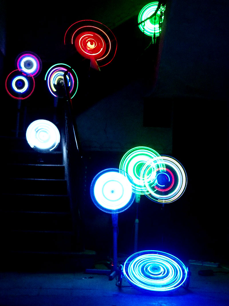 Sensorial Discomfort creates a disturbing while dynamic atmosphere that causes the viewer a feeling of discomfort and confusion. The movement generates light using rotating blades that draw colored lines that increase the feeling of speed. It follows a tension enhanced by the sound design, which, after a long and careful look, becomes protagonist.