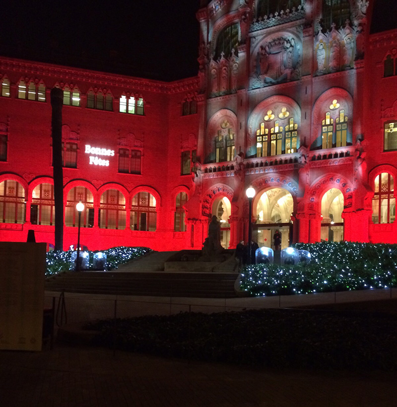 The façade of Recinte Modernista de Sant Pau in Barcelona presents a special illumination this Christmas created by students of the subjects Digital Creation i Typography Creation of EINA, based on gobos* and specific typographies.