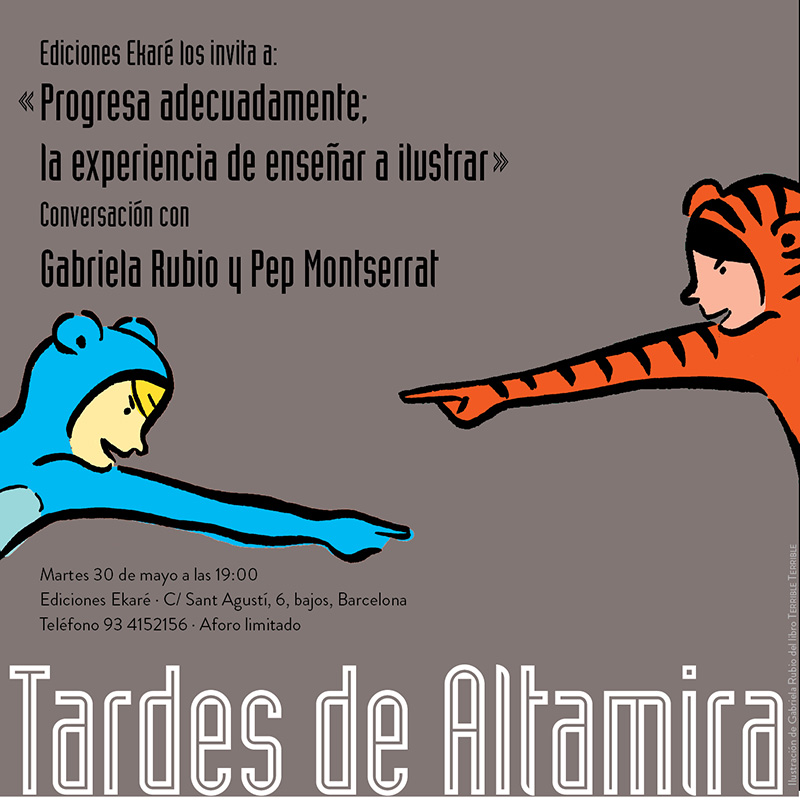 On Tuesday 30th of May, the chat "Progresa adecuadamente; la experiencia de enseñar a ilustrar" (Satisfactory Progress; the Teaching and Illustration Experience) with Gabriela Rubio, illustrator and coordinator of EINA's Specialisation Course for Children and Youth Publications and Pep Montserrat, will take place.