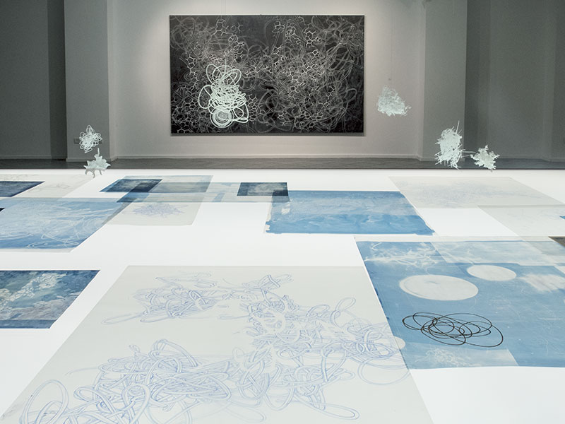 The series of paintings and installations do not intend to illustrate but to respond to these scientific landscapes, creating a dialogue between science and art, between objectivity and subjectivity, one that discusses the different ways of visualising what can’t be seen. The exhibition responds to the irresistible attraction of creating and displaying new interpretations of the world while trying to make visible or intuit what isn’t seen.