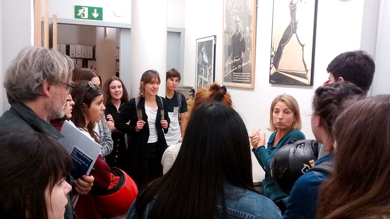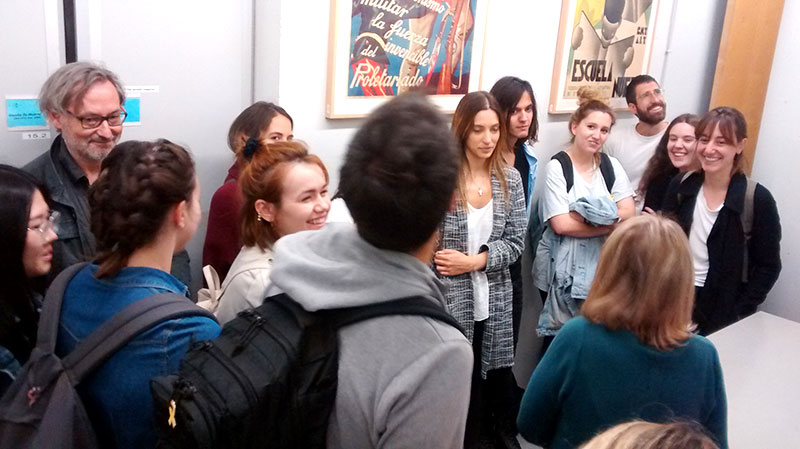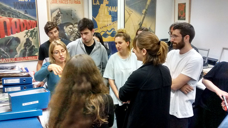 The visit was completed with an explanation of the collection of the (CRAI-UB) library/archive, housed in the basement, which contain major collections of graphic and text materials, especially propaganda from the Civil War period, the Franco years, the Transition and up to the present day.