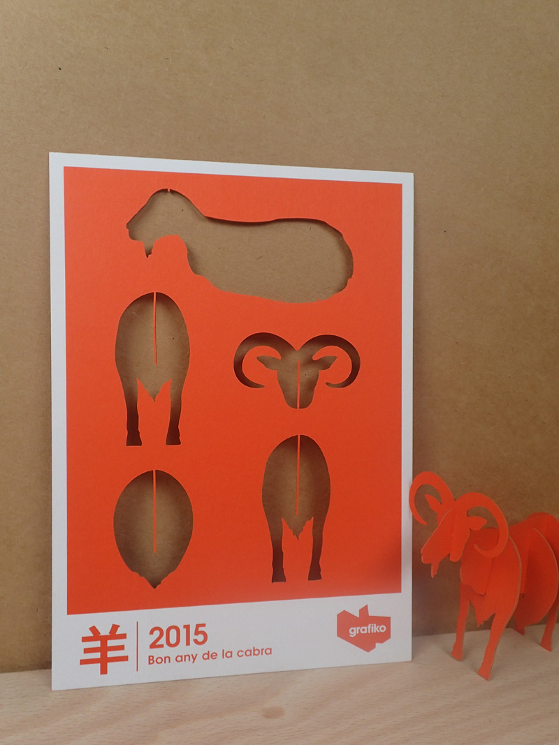 In the program Elements of Graphic Design, within the subject Projects 1, with Pilar Górriz, a real briefing by graphic arts company grafiko was the challenge presented to second year students of graphic design; a project holding the objective of congatulating the new year 2015. Shortlisted proposals receiving most votes where those presented by Badia + Fabrellas + Timonet, Laia Closas, Tomàs Lóbez and Miquel Vila. Oriol Cabarrocas’ Year of the Goat design was the final selected and produced piece.