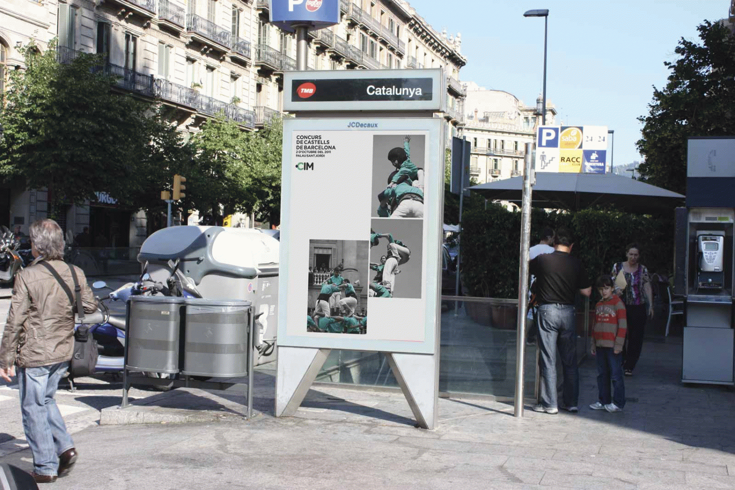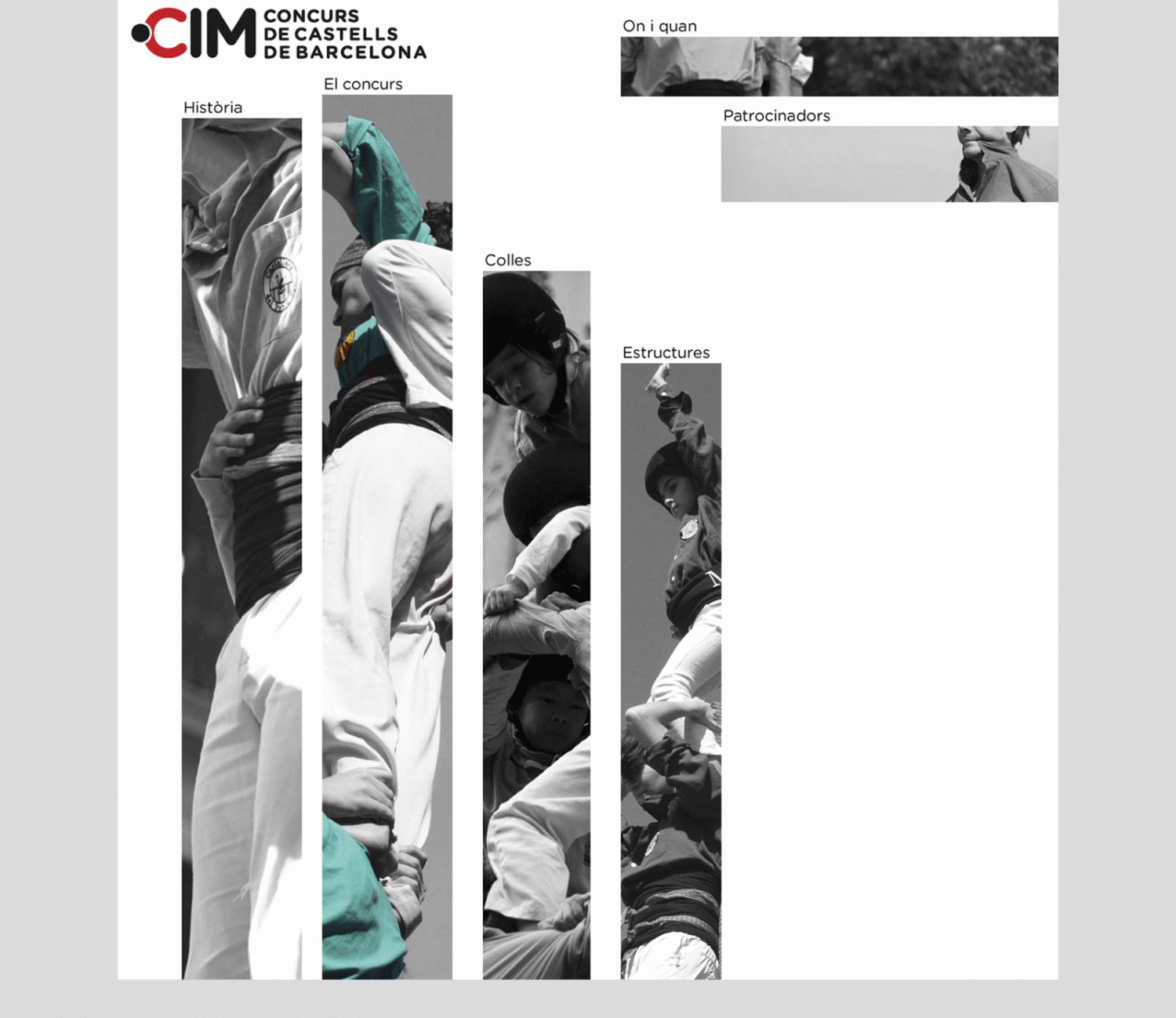 The aim of the competition, its image and promotion is to open up the world of human castles – itself a tight-knit community – to everyone who is unfamiliar with it. This means applying graphics in a setting where the importance of design is not always noticeable. The whole project is based on an iconic simplification of human castles using the colours of the groups' shirts. Simplification begins with the name, so, the Barcelona Human Castles Competition is replaced with CIM (PEAK) to simplify the idea of a completed castle or the summit being reached. Finally, the posters use a sequence explaining how the castle is built and ignore colour where it is not important, but maintain the shirts which are in relief in the image.