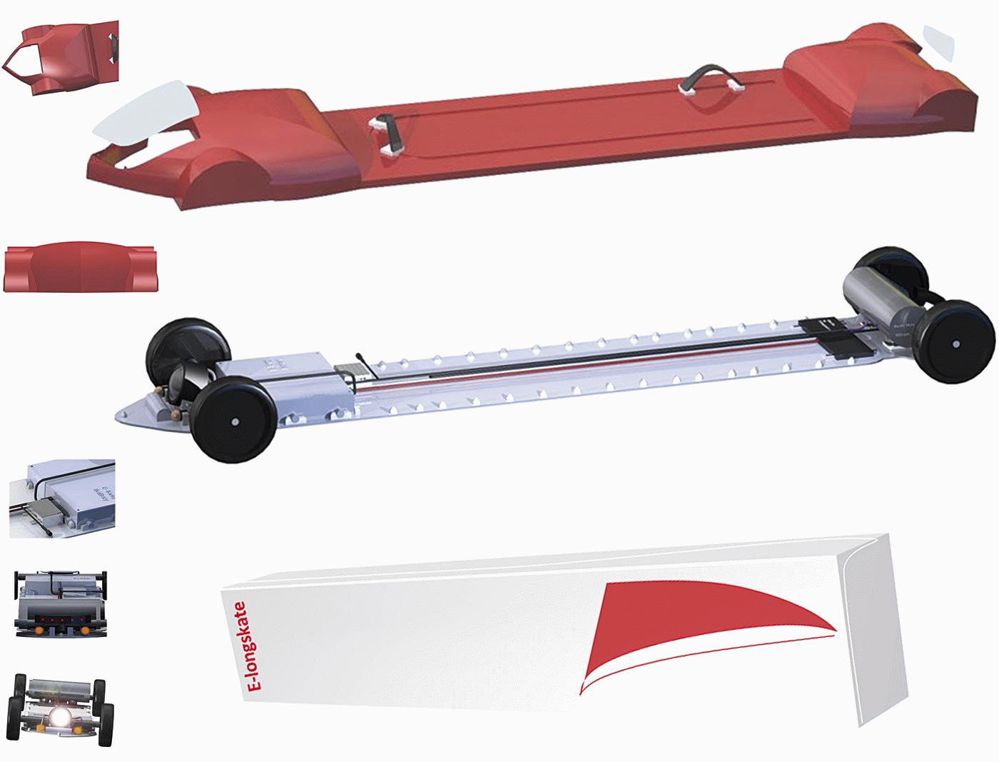 E-Longskate is a skateboard conceived on the basis of the redesign of the conventional electric skateboard. Thanks to this device, all kinds of user (including the partially disabled) can go skateboarding, and it provides society with a comfortable daily mode of transport that uses non-polluting energy.