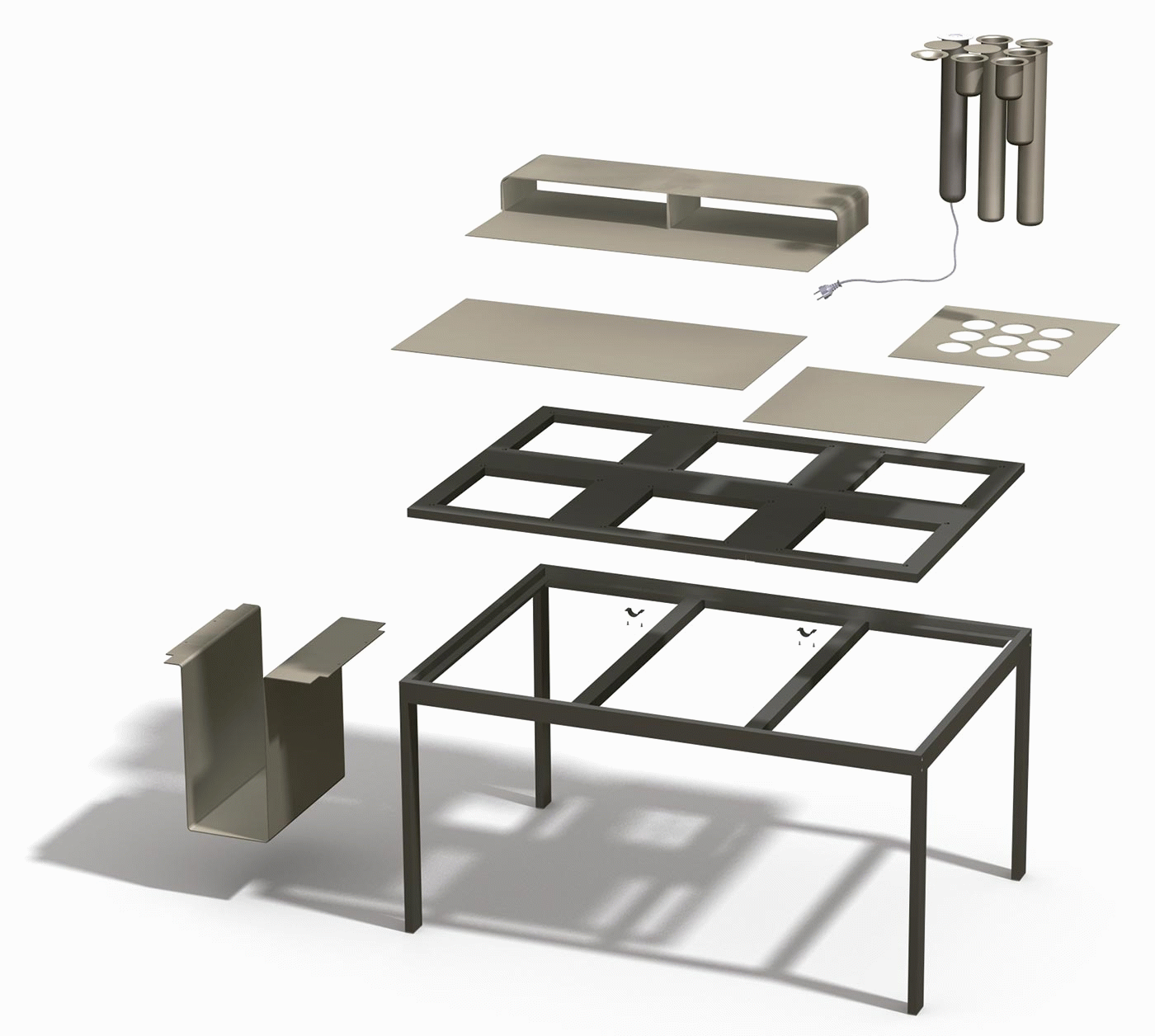 The end product is comprised of a metal structure plus a wooden board on which different 50x50cm modules are placed which the user can choose according to their needs. Iron framing, a plywood board, ABS and embossed aluminium are used in their manufacture.