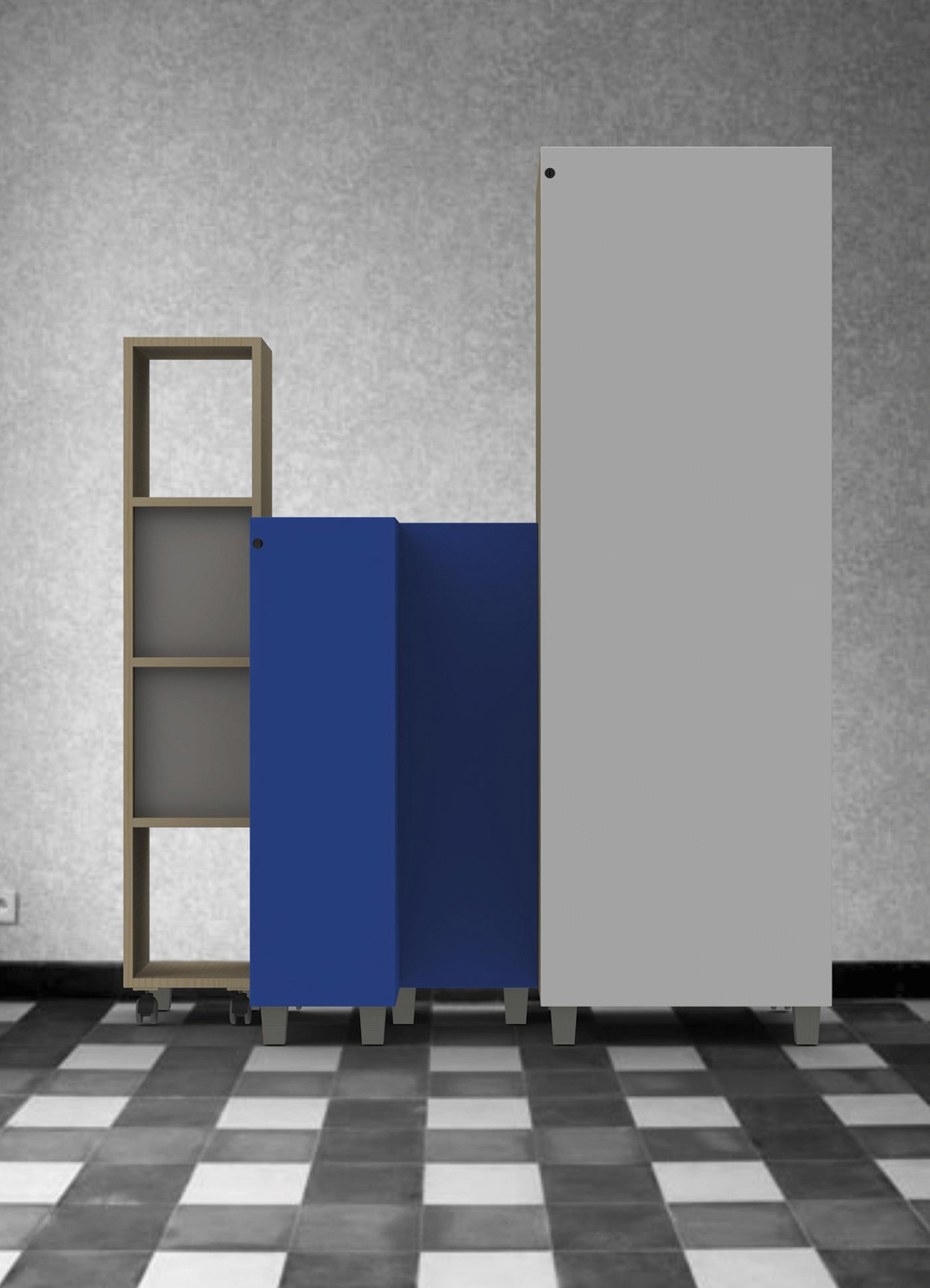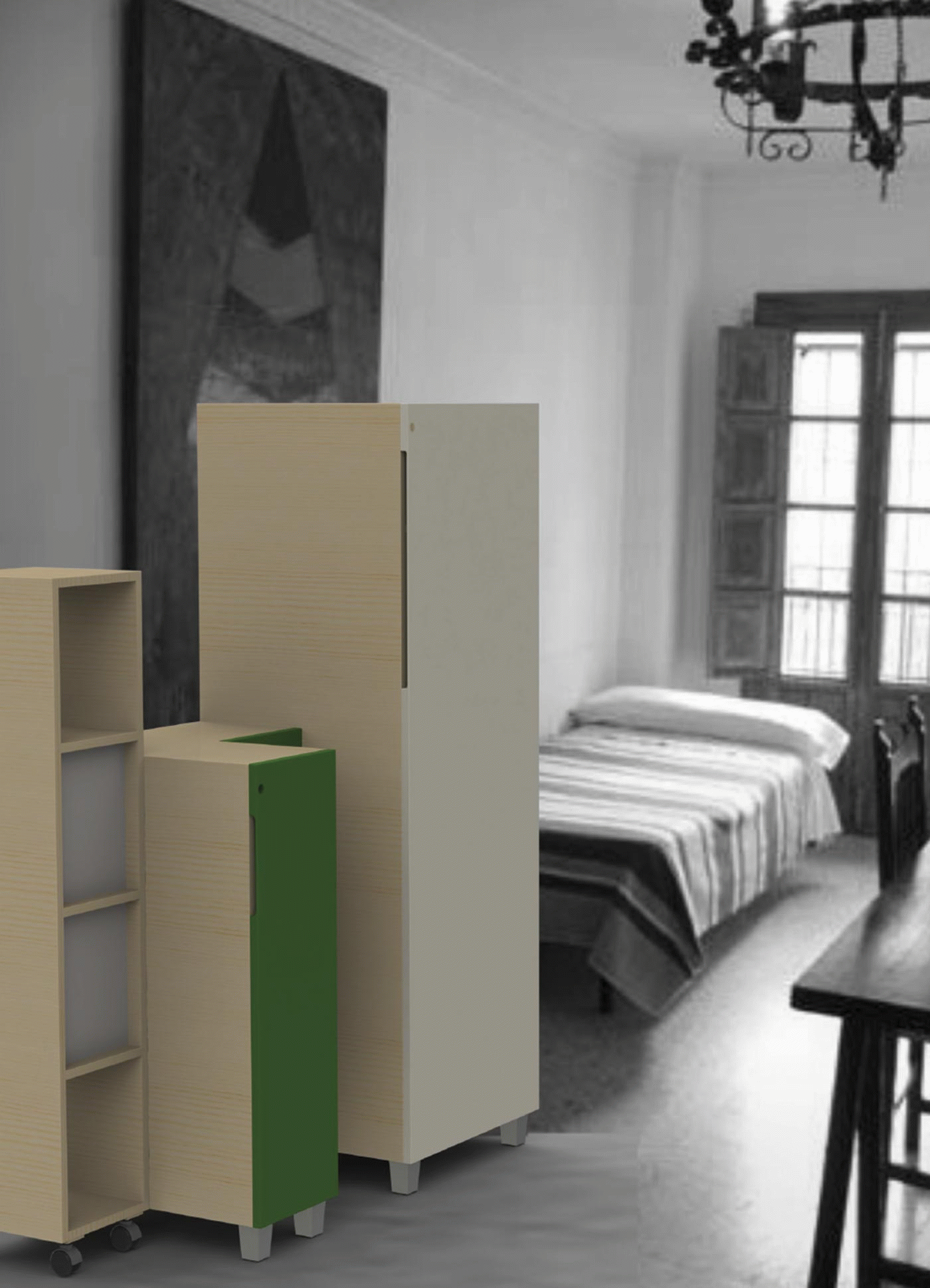 This set seeks to solve the organisation of elements such as shoes, clothes or personal belongings in small spaces or in areas that have to be shared, including the bathroom and kitchen.