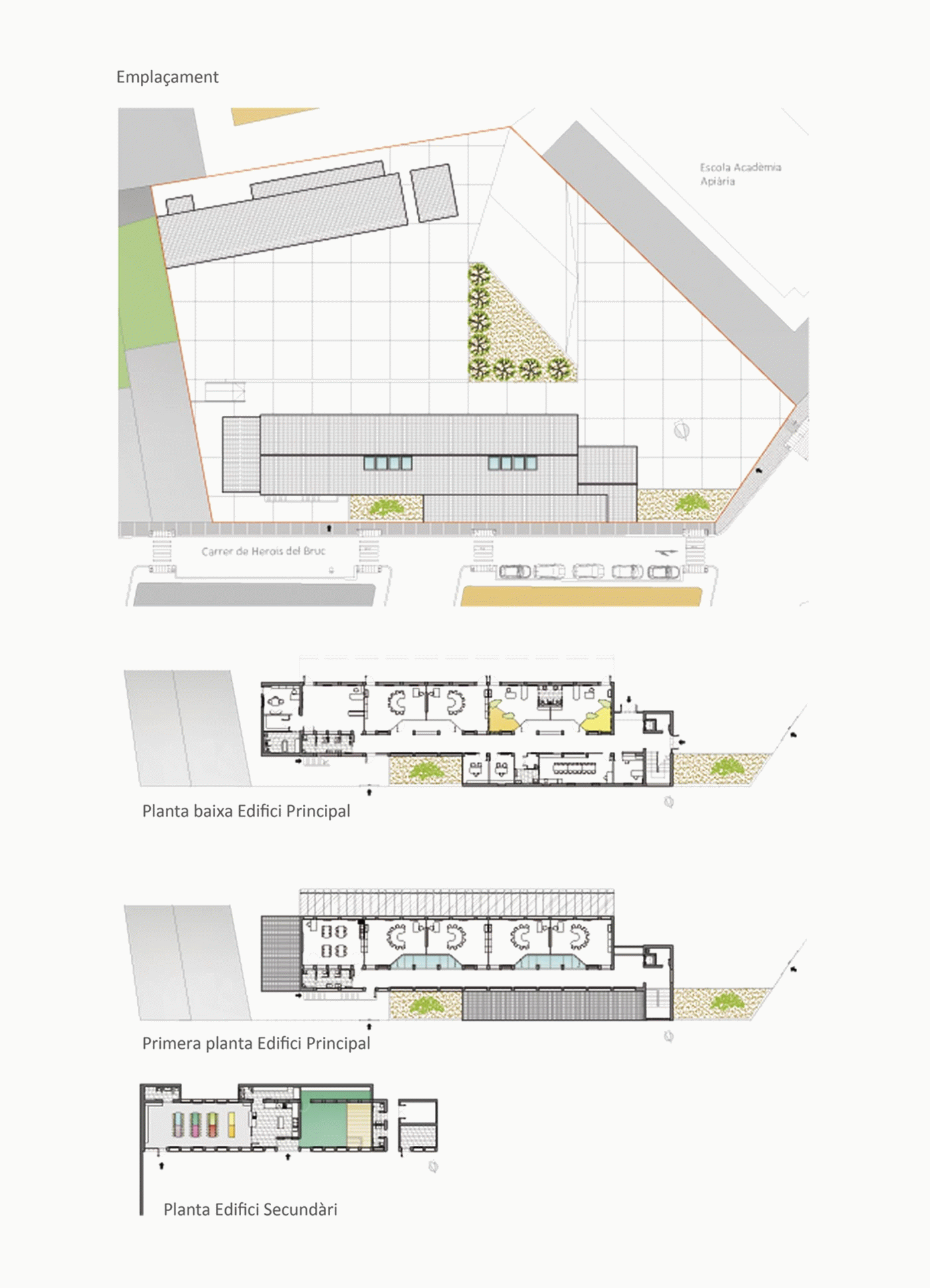 Bearing in mind that the building was already equipped as a school, the aims of the project revolve around designing the interior, giving the classrooms a more functional distribution, designing furniture adapted to the use of each classroom, getting rid of architectural barriers and developing the intakes of natural light to make full use of it. Also important is the creation of a double space, with a visual effect, that links the two floors of the main building without affecting the different uses of the spaces and the renovation of the façade to give it a more modern appearance.