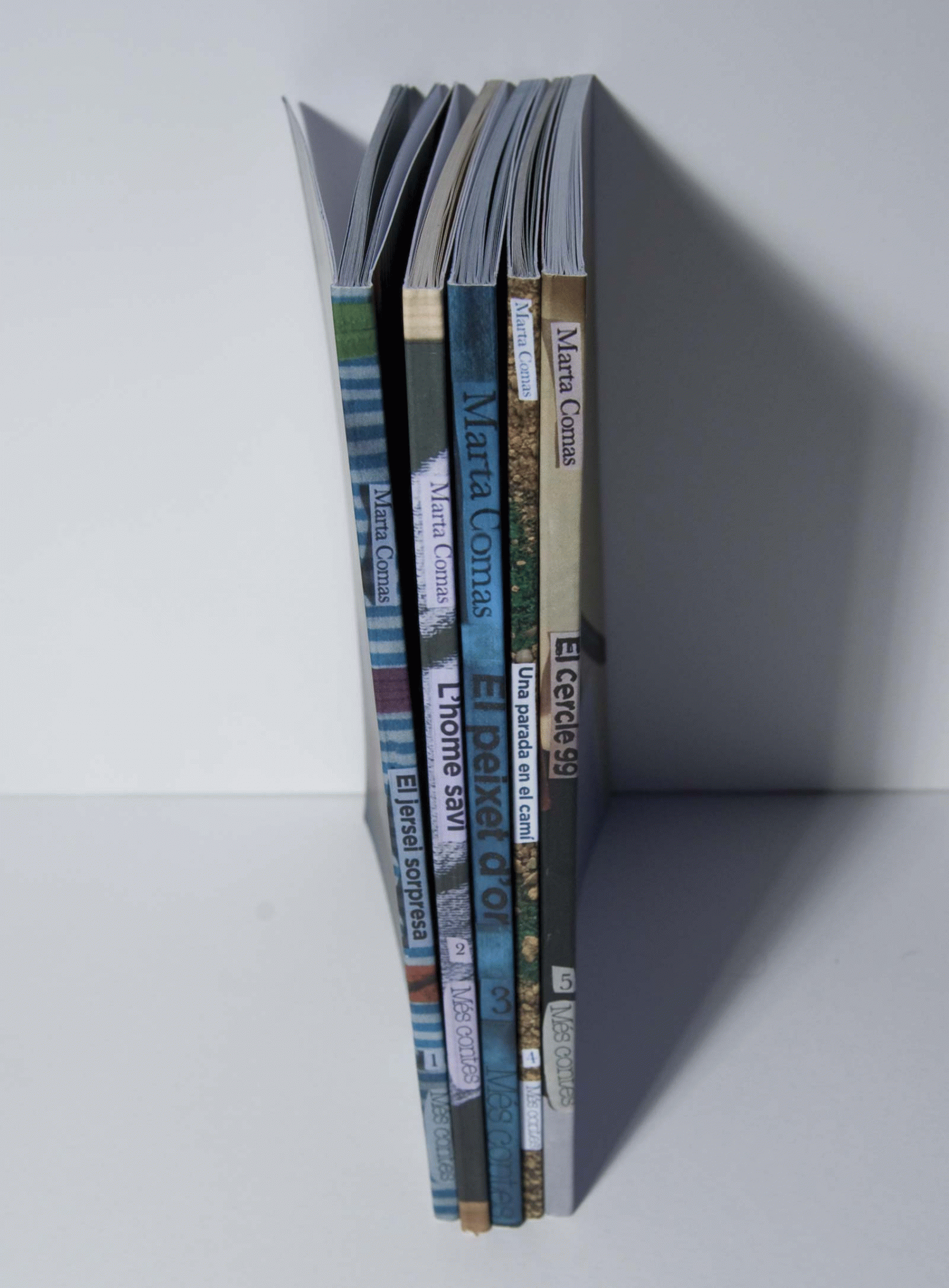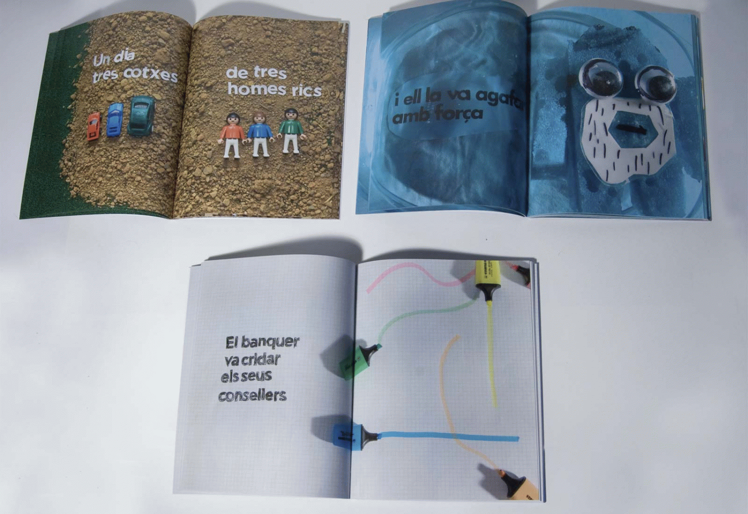 Photography is the visual resource used to explain the stories, as it incorporates all the elements and drawings into the text. I use objects that children would find familiar and that relate to the subject of the story: sand from the park and toys in A Stop on the Path; blackboard and drawing in The Wise Man; their school overalls, TVs and buttons in The Surprise Sweater; a book and writing and painting materials in Circle 99, and, lastly, water, toys and stones from the river in The Golden Fish. I decided to use the language children use now, and put to one side the classic illustrations and stories that today seem obsolete.