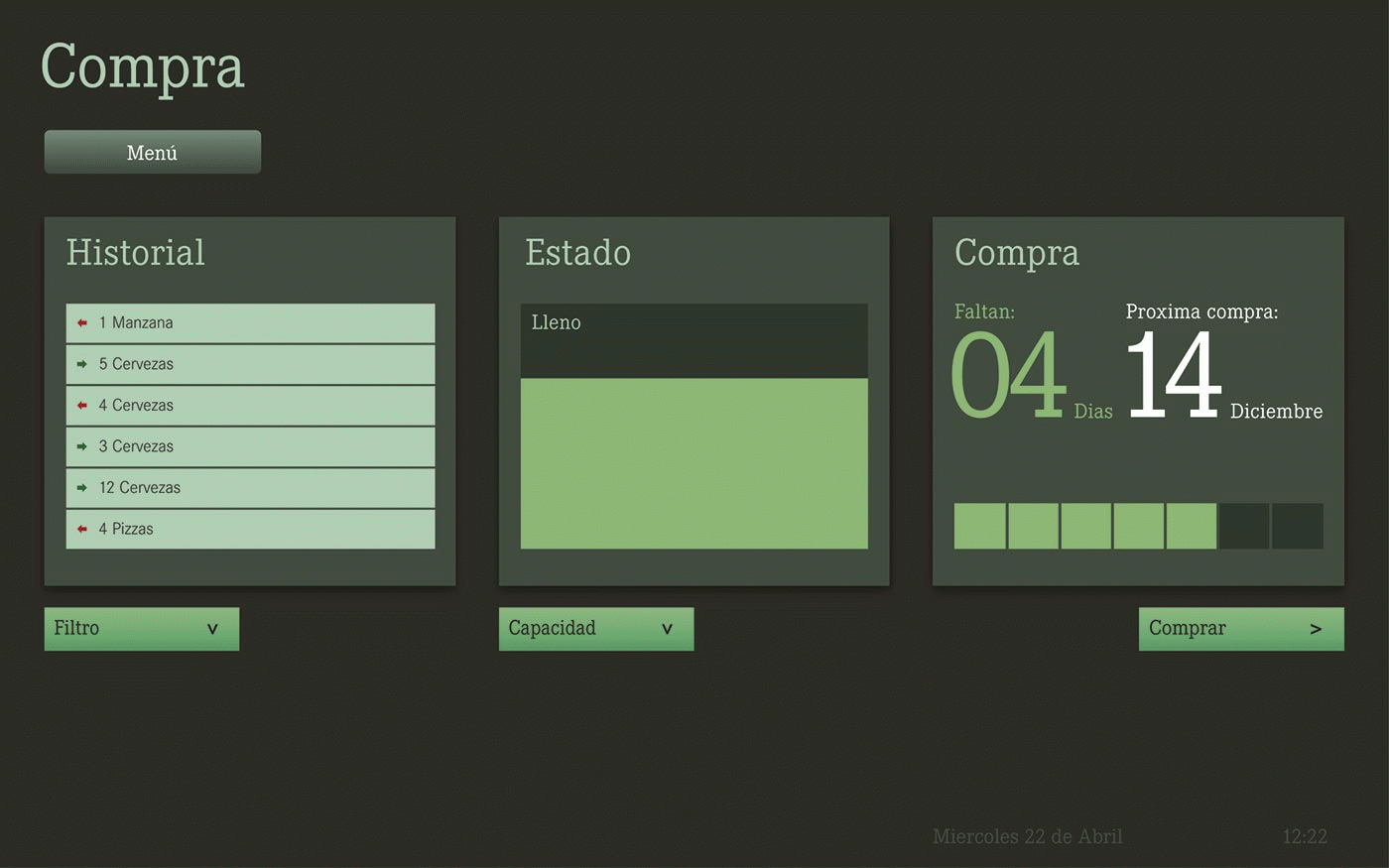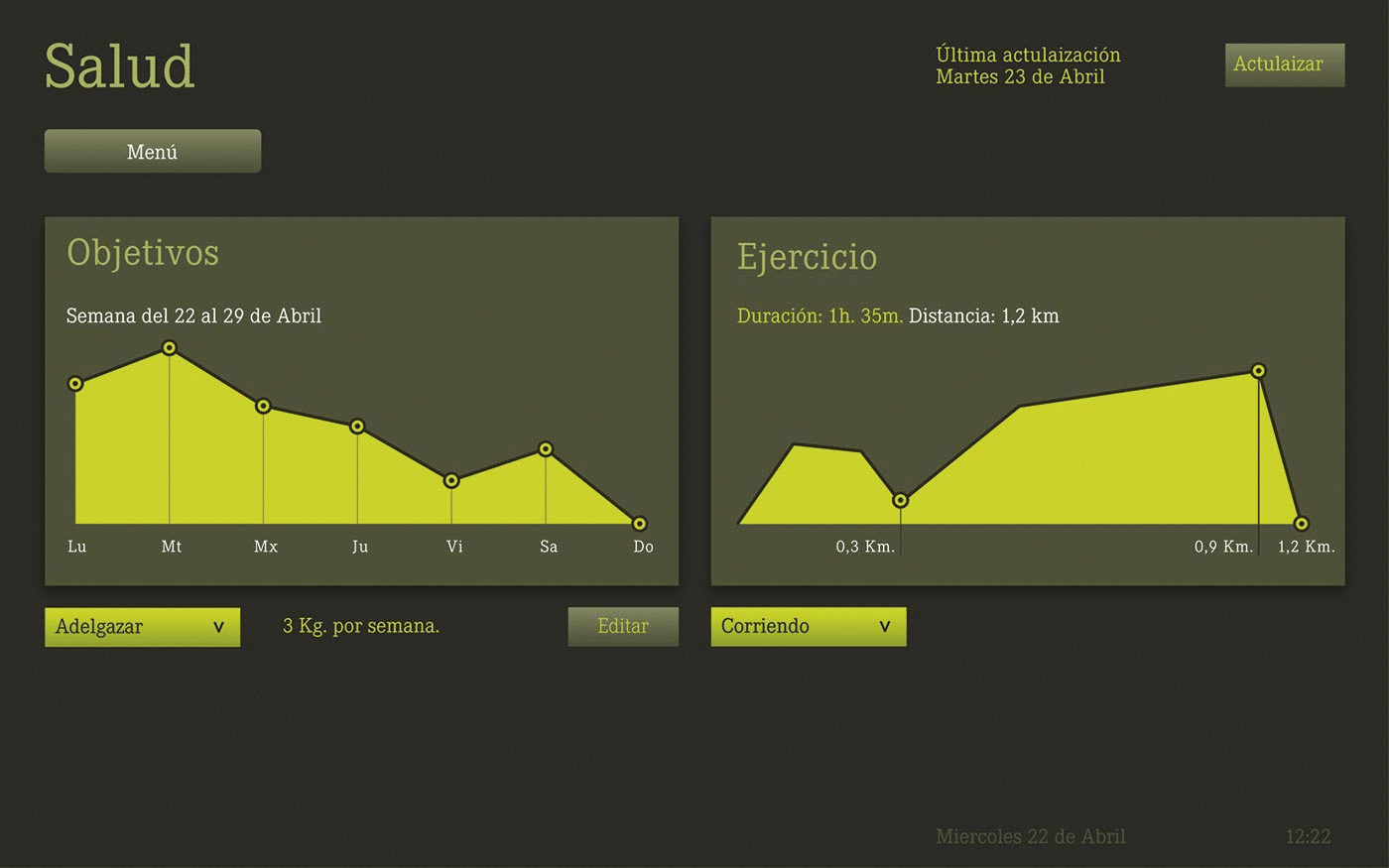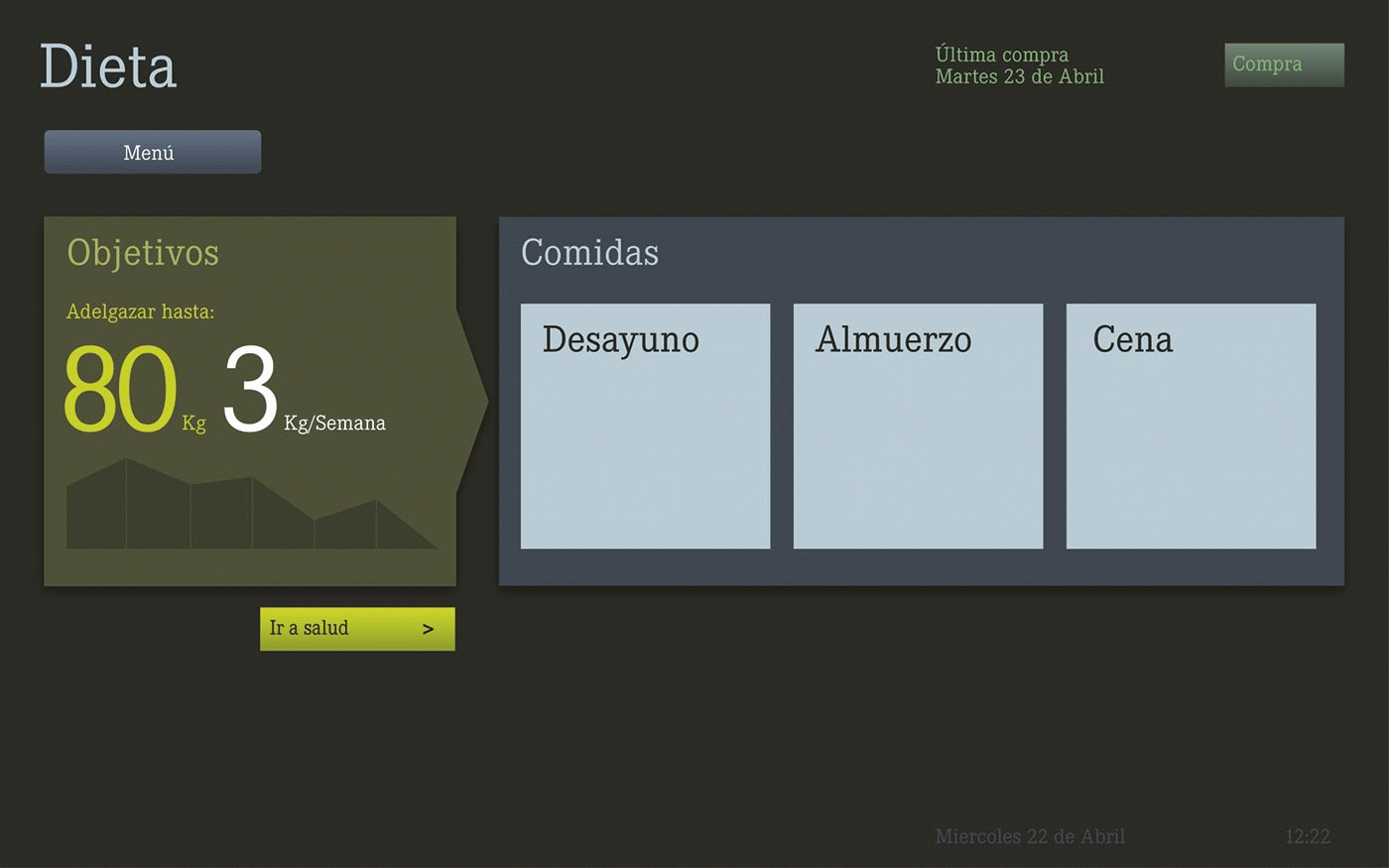 This refrigerator would be for middle-aged or young users, who, first and foremost, are interested in adopting new technology that will make comfortable improvements to their health. The system comprises three modules: Health, Diet and Shopping, which communicate with each other. The idea is to create a product, which, as we go about our everyday life, advises us as to what we should eat, or the exercise we should be doing, but one that we do not have to pay too much attention to and one that is not too restricting.