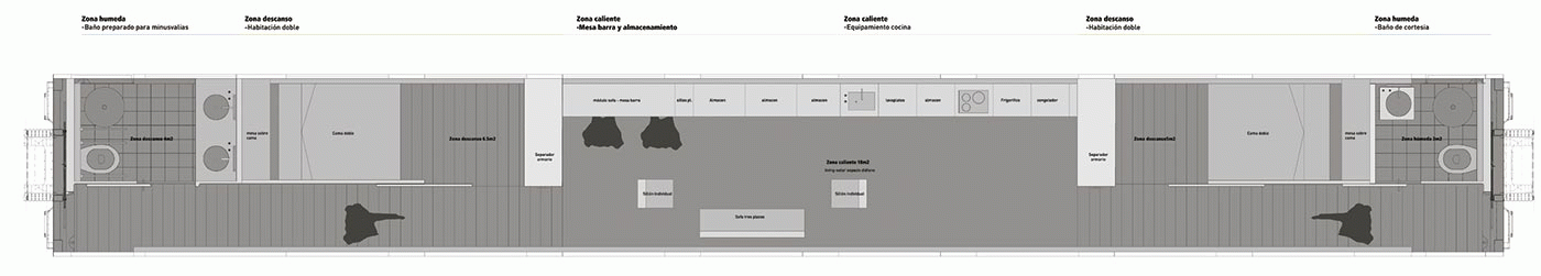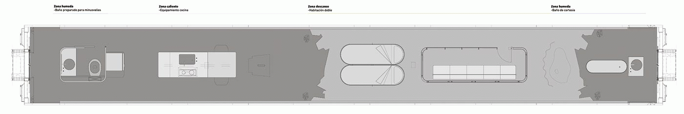 The format of housing that has been chosen has its background in the American culture of motor-homes and in the nomadic practices associated with the train or more modern phenomena such as the communes of Berlin and San Francisco. Consequently, the theoretical and conceptual basis of the project can be found in references to recognised authors in the field of history, anthropology and philosophy.