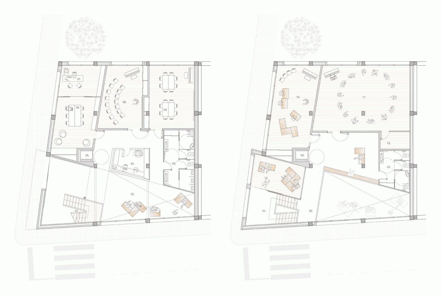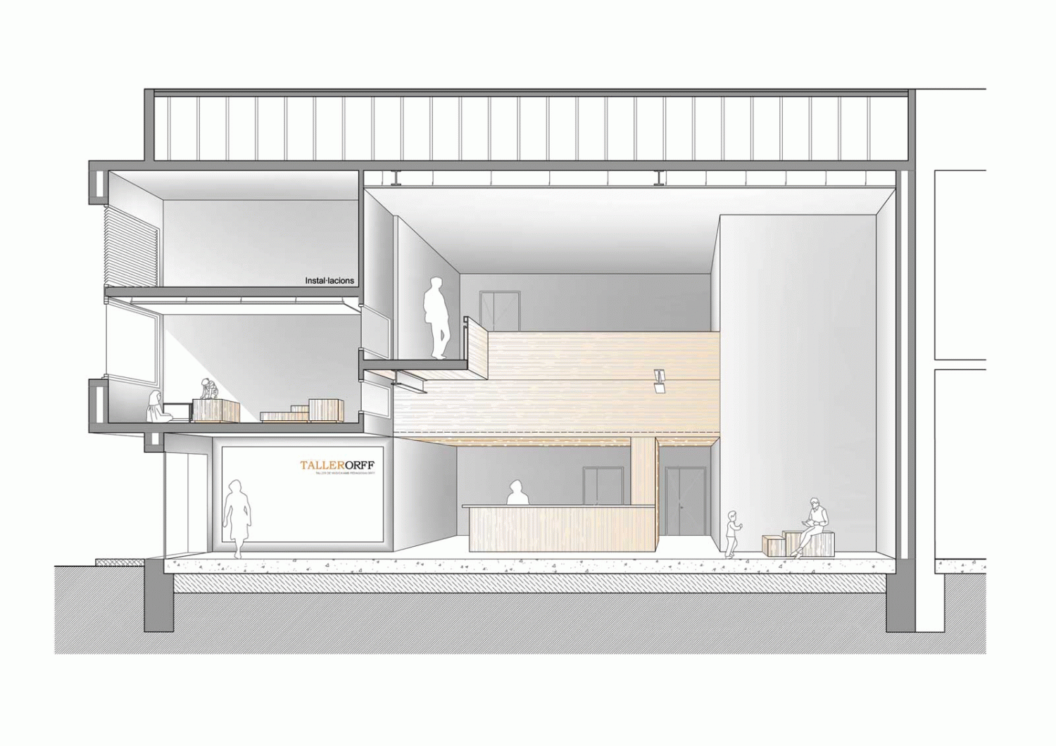 The aim of the design was to create a relationship between the different floors, by opening up a double space to develop a joint idea and distribute the different functions from this point. The zone is divided into public and private areas, isolating and conditioning the space from interior acoustic contamination and improving the functioning of the Orff Workshop.
