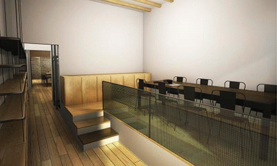 The proposal includes a studio at street level (professional area) where design students have the opportunity of working as though they were in a professional design studio.
