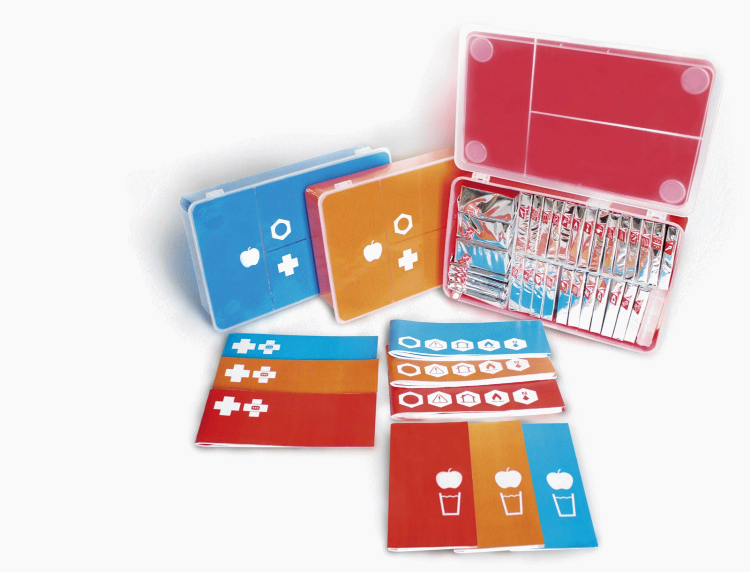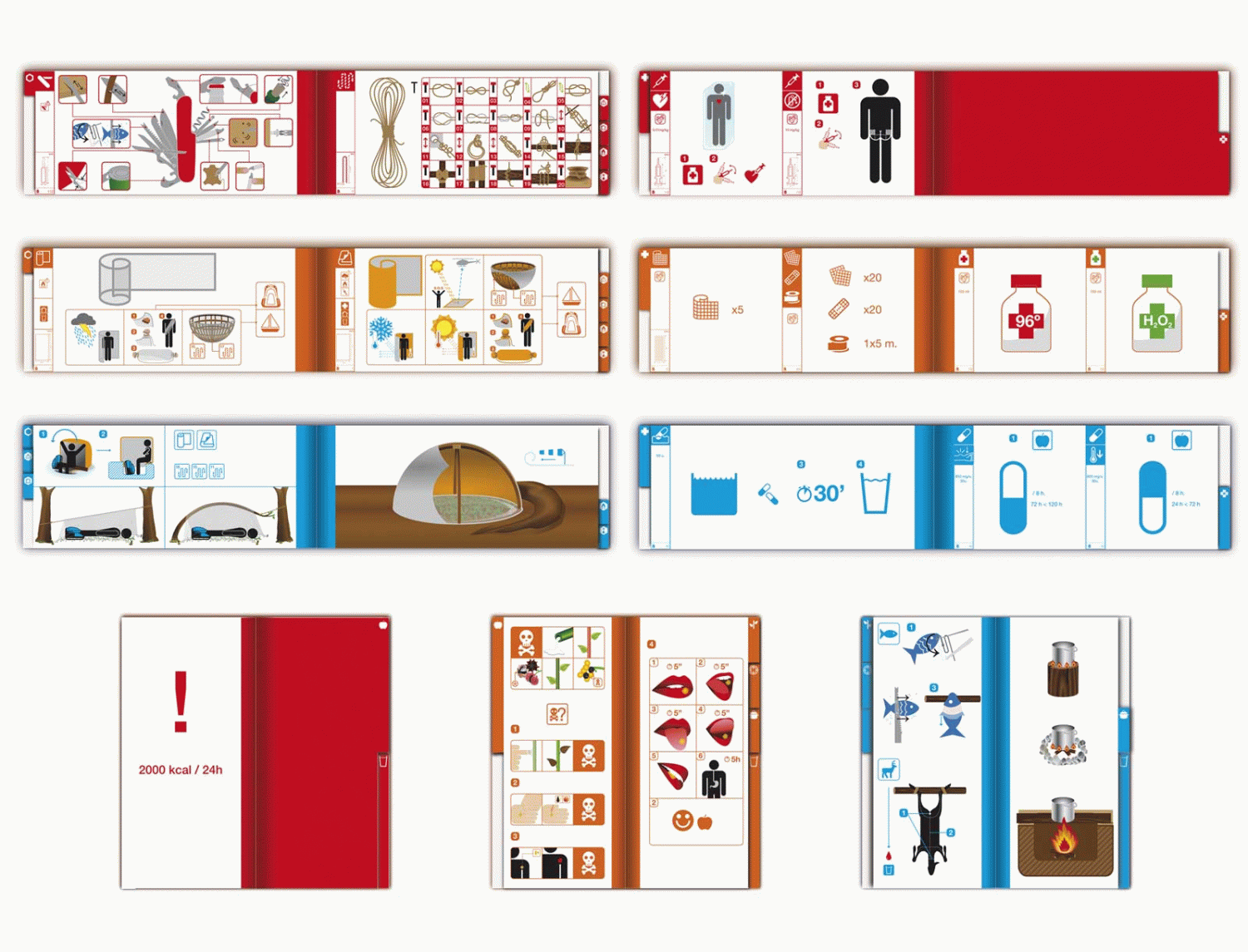 An extreme situation is presented regarding food where this and water are not easy to obtain, e.g. an aeroplane crash in the mountains which means that you have to survive under adverse conditions until you are rescued. This is where this survival kit comes into its own, with the added value of putting into practice a form of wordless communication, limited to the graphic and universal language of pictograms and infography. there are three kits: red (mountain), orange (sea) and blue (desert). The colour coding contrasts with the chromatic dominance of the landscape context in each setting. The kits are sealed plastic containers divided into three sections: tools, first aid kit and food. Each item in the kit is wrapped in a double-layer film to preserve as fully as possible. The pictograms indicate what each package contains and, in turn, act as an index so users know where to find the explanation or relevant uses in the leaflets. The tab system and its reticular positioning means that the item can be found and removed instantly. All graphic language is synthetic and schematic to make it easy to understand.