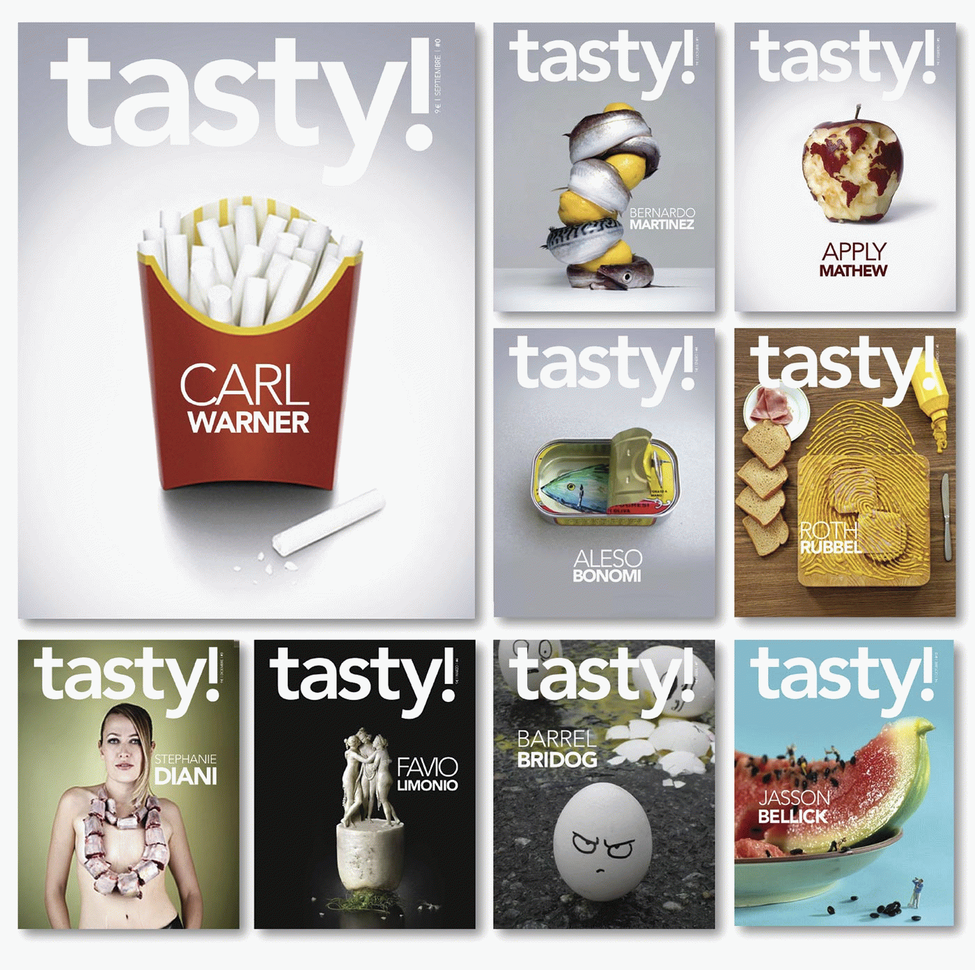 This project consists of the creation and launch of a monographic magazine that exploits the formal side to food through murals, illustrations, photographs, scale-models, sculptures, etc. Tasty! Is a monthly magazine with a guest author for each edition.