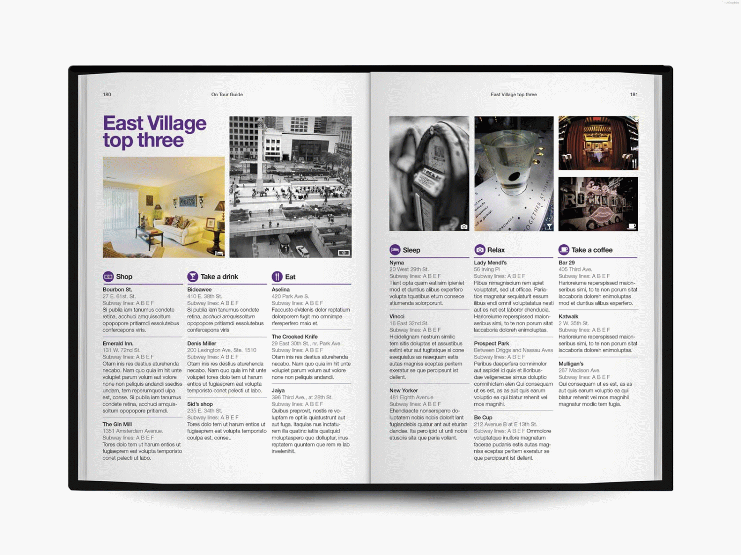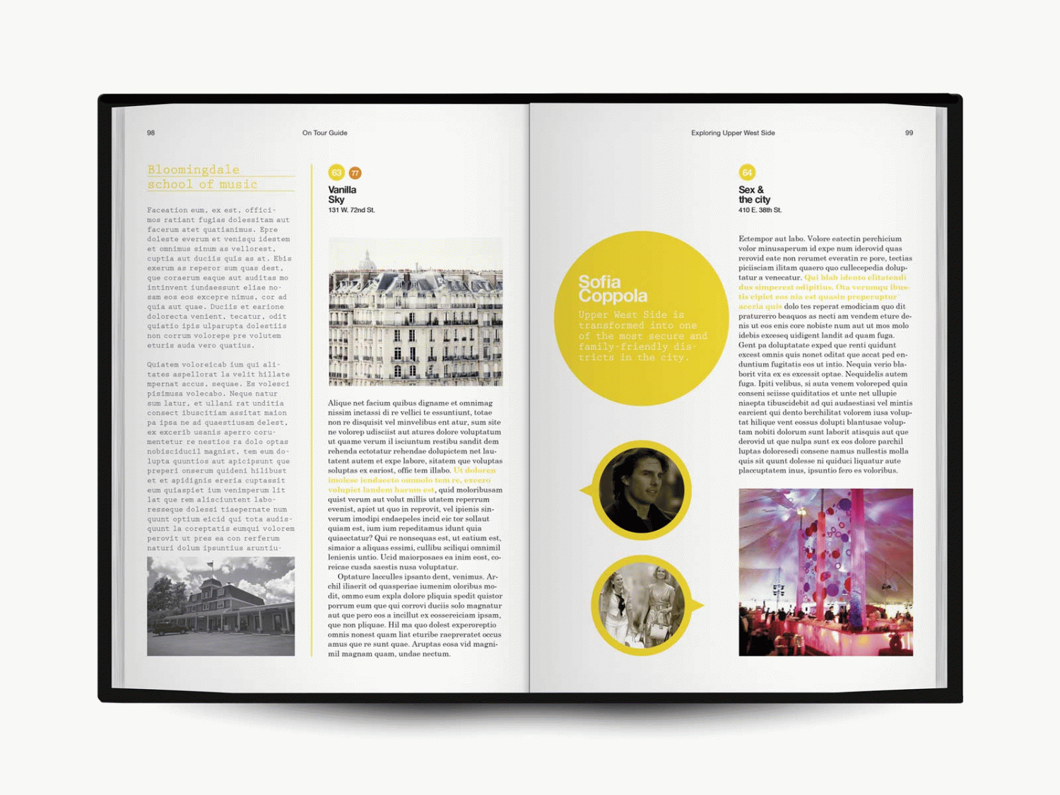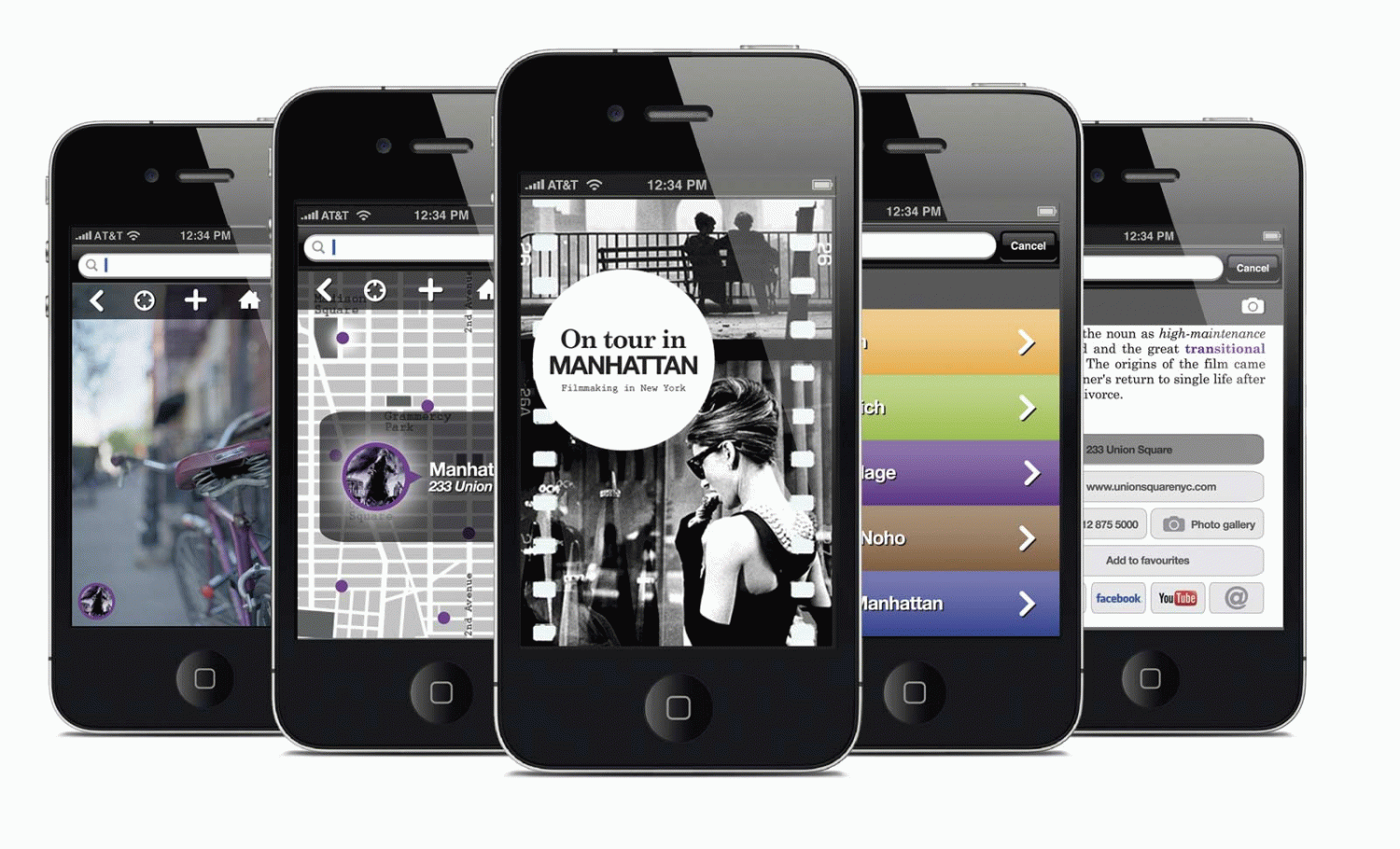The project is based on the creation of a collection of travel guides called the "On Tour Collection". Each of these guides offers visitors the chance to discover a destination, always through the prism of the cinema and TV series. Using it, they discover monuments, squares, streets, buildings, museums, markets, etc., that have played an important role in the history of audiovisual events, relevant information, anecdotes and the film locations of famous scenes. To create the Manhattan guide – which acts as the prototype – I have taken as my reference the design of the New York subway, as this system is easily identified with the city and, what's more, contributes the required tourist-centred component. The editorial piece will be complemented by a mobile app for users to find out everything they find interesting. On Youtube, they can view the scene filmed in the location where they currently are and can experience it with augmented reality.