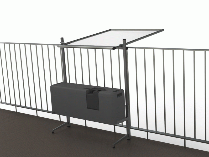 70L es un colector de agua de lluvia para instalar en un balcón o en una terraza. Es un sistema autosuficiente que recoge el agua de lluvia en una superficie abatible y la lleva hasta un depósito de 70 litros de capacidad.