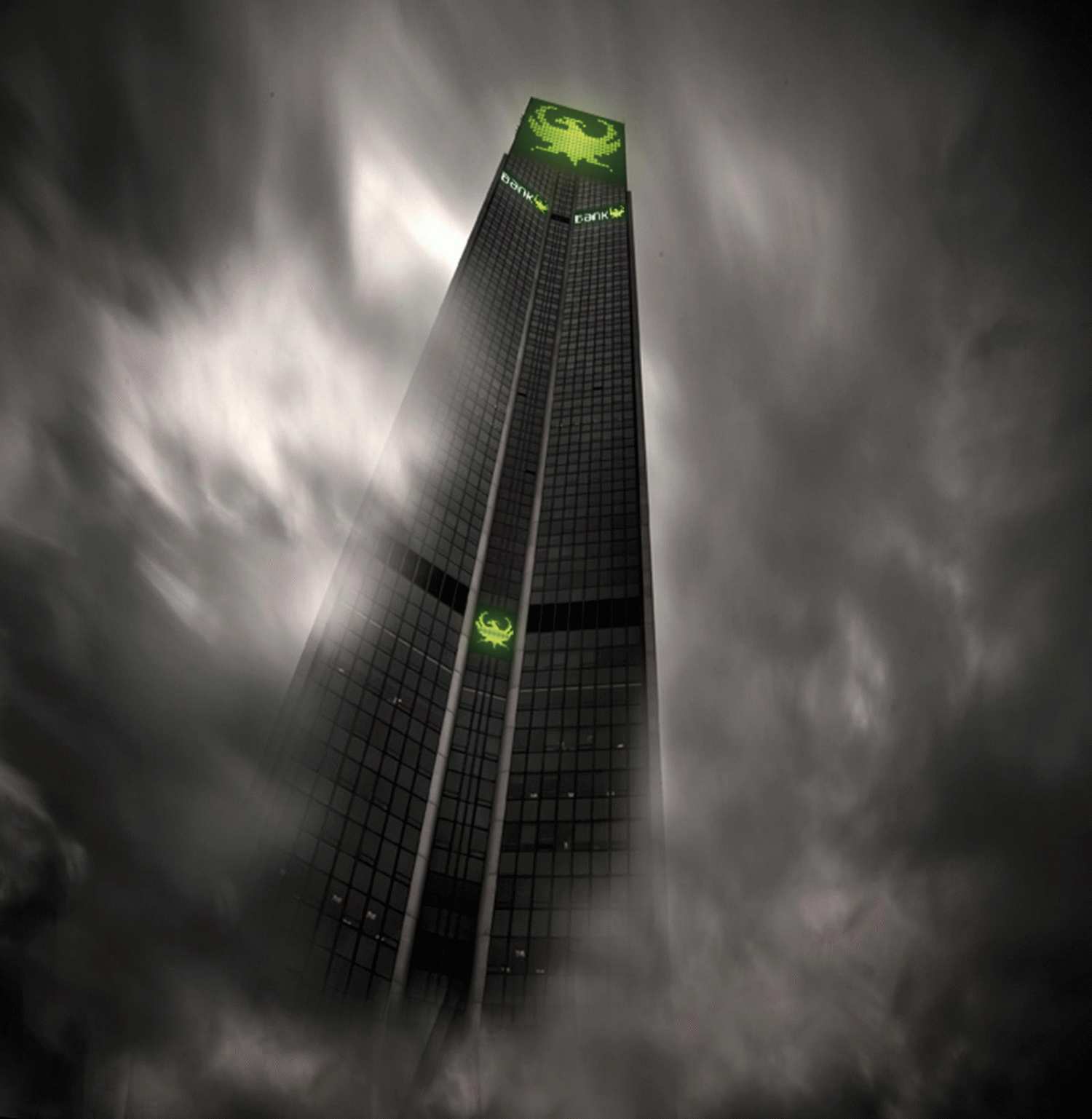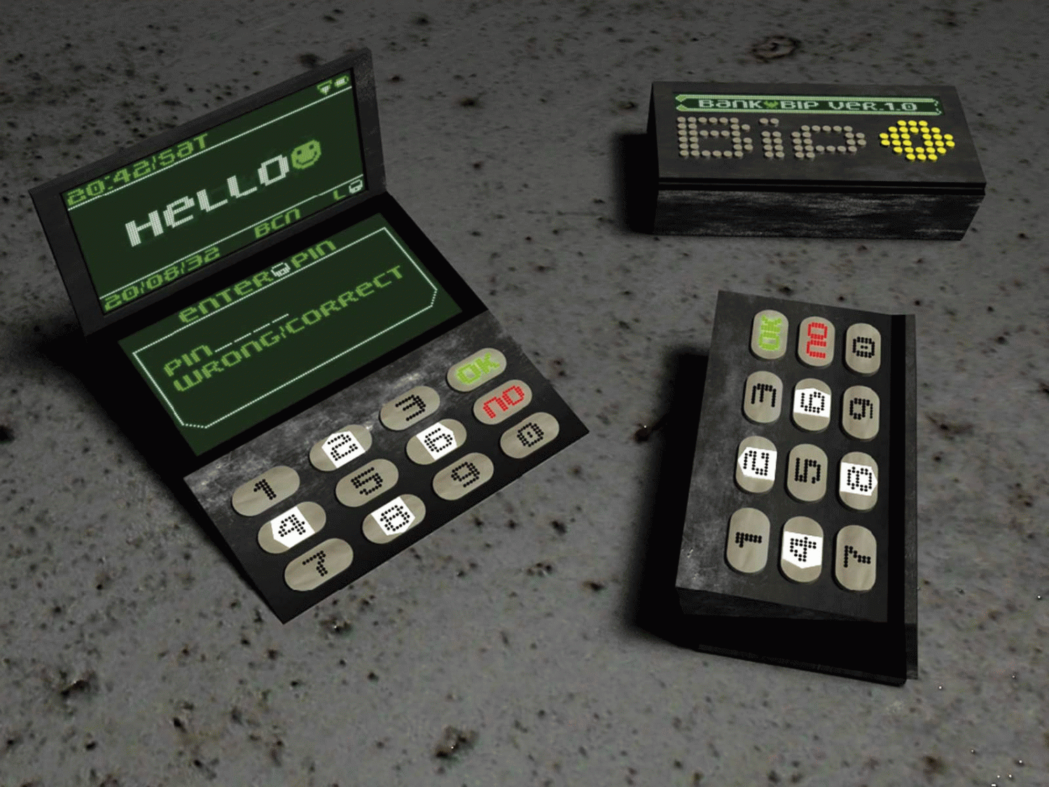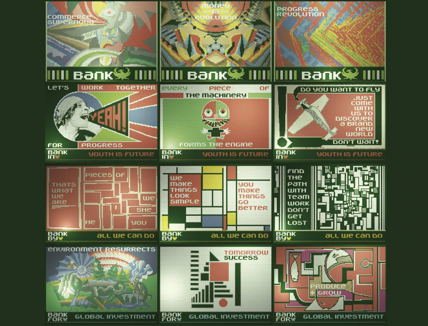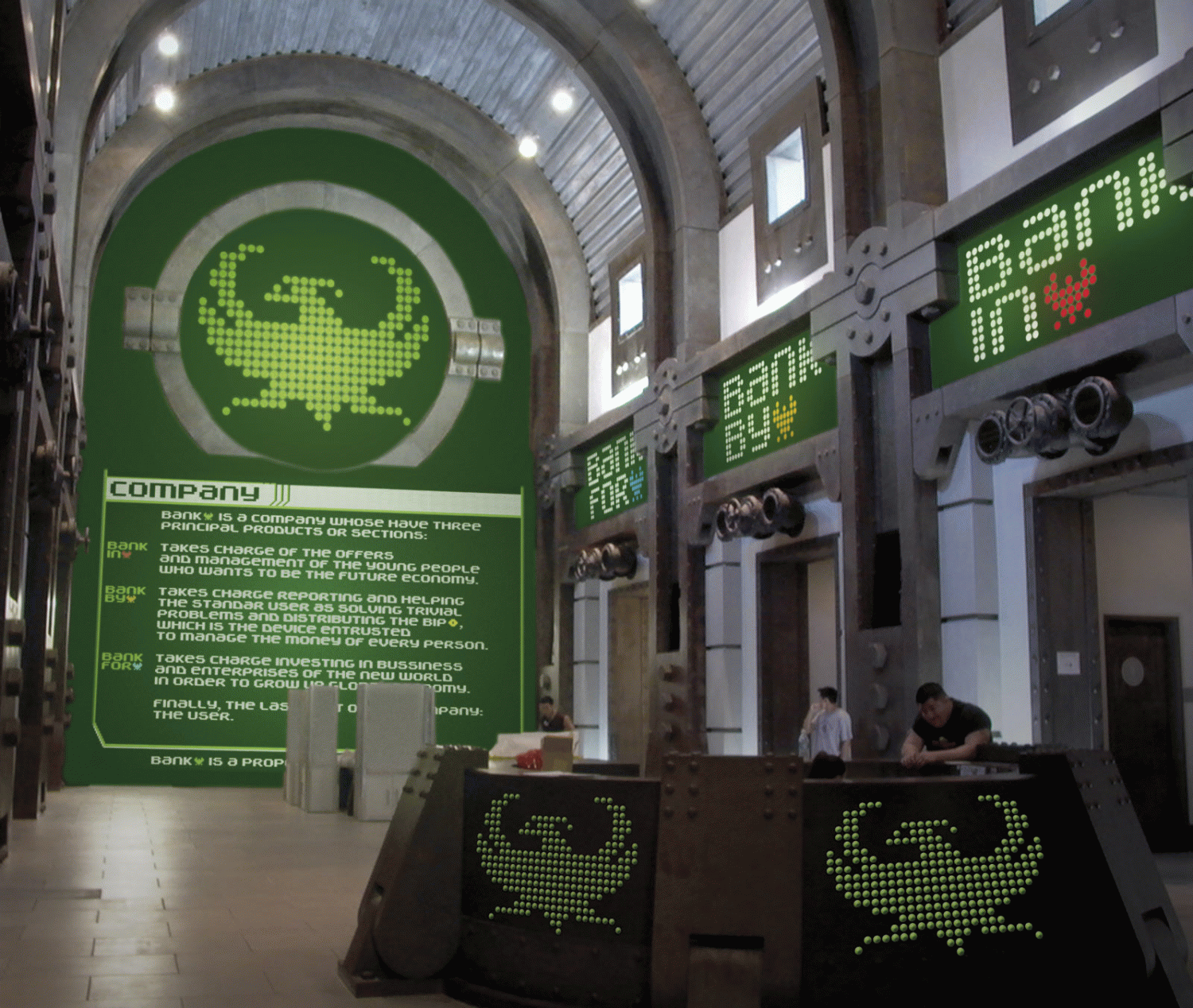 Este proyecto intenta resolver una situación de comunicación ficticia: la gráfica adecuada a un banco que aparece en un contexto postapocalíptico; es decir, una entidad financiera que actúa en un escenario de ciencia ficción de la reconstrucción del mundo luego de una catástrofe devastadora. El desarrollo del proyecto, debido a su naturaleza y punto de partida, se inscribe en un terreno experimental, más que realista-profesional. Por eso adopta un lenguaje que recuerda a la gráfica de los videojuegos o la SCI-FI. El proyecto basa toda la gráfica en un sistema matriz de puntos de luz que funciona de una forma parecida al pixel art. La gráfica, ya sea tipografía o imagen, se ciñe a esa matriz, lo que determina la apariencia básica del proyecto. La técnica utilizada viene definida por un contexto que supone un renacimiento del diseño (al estilo de los movimientos de la vanguardia artística).