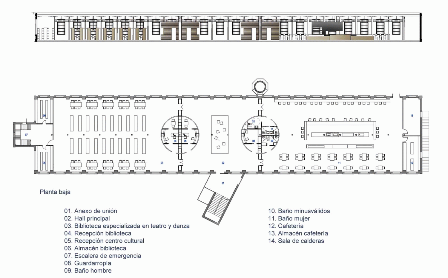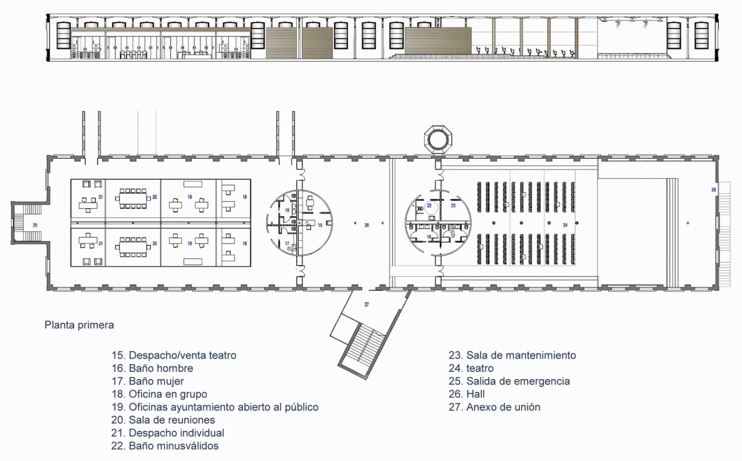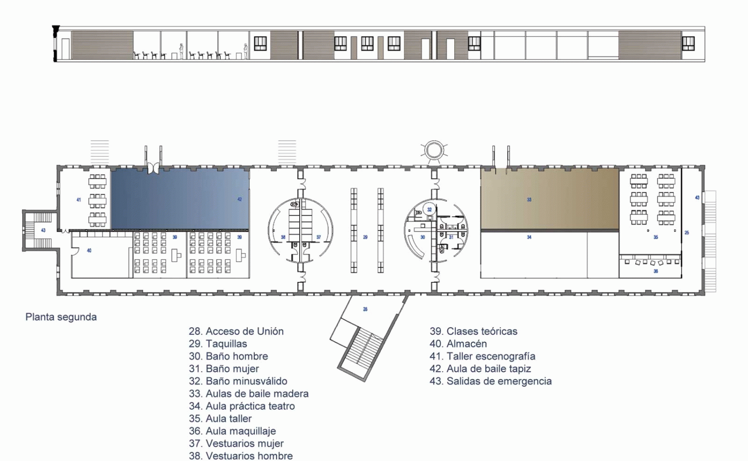 La nave consta de tres plantas de 15 m x 75 m en las que se prevé poner en marcha un programa que incluye un teatro con un aforo de 145 plazas y las instalaciones propias de una escuela de teatro y danza, con biblioteca y cafetería. Para poder unir los diferentes niveles se ha creado un anexo al edificio que no sigue la simetría marcada por la fábrica.
