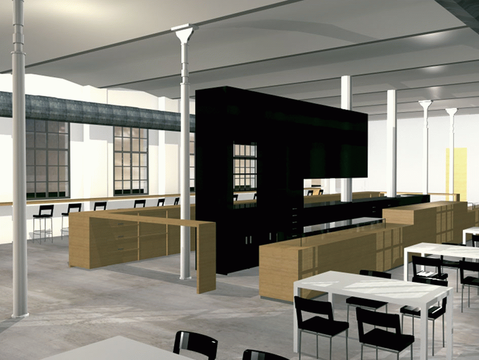 El eje del proyecto reside en la ruptura de la simetría lineal de la fábrica mediante unos volúmenes cilíndricos que singularizan la intervención.