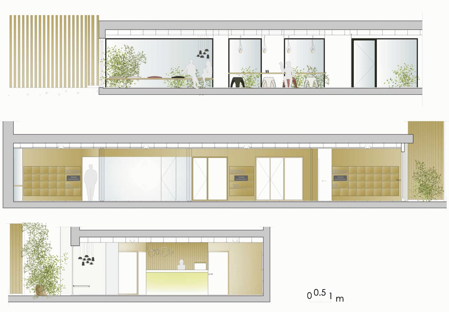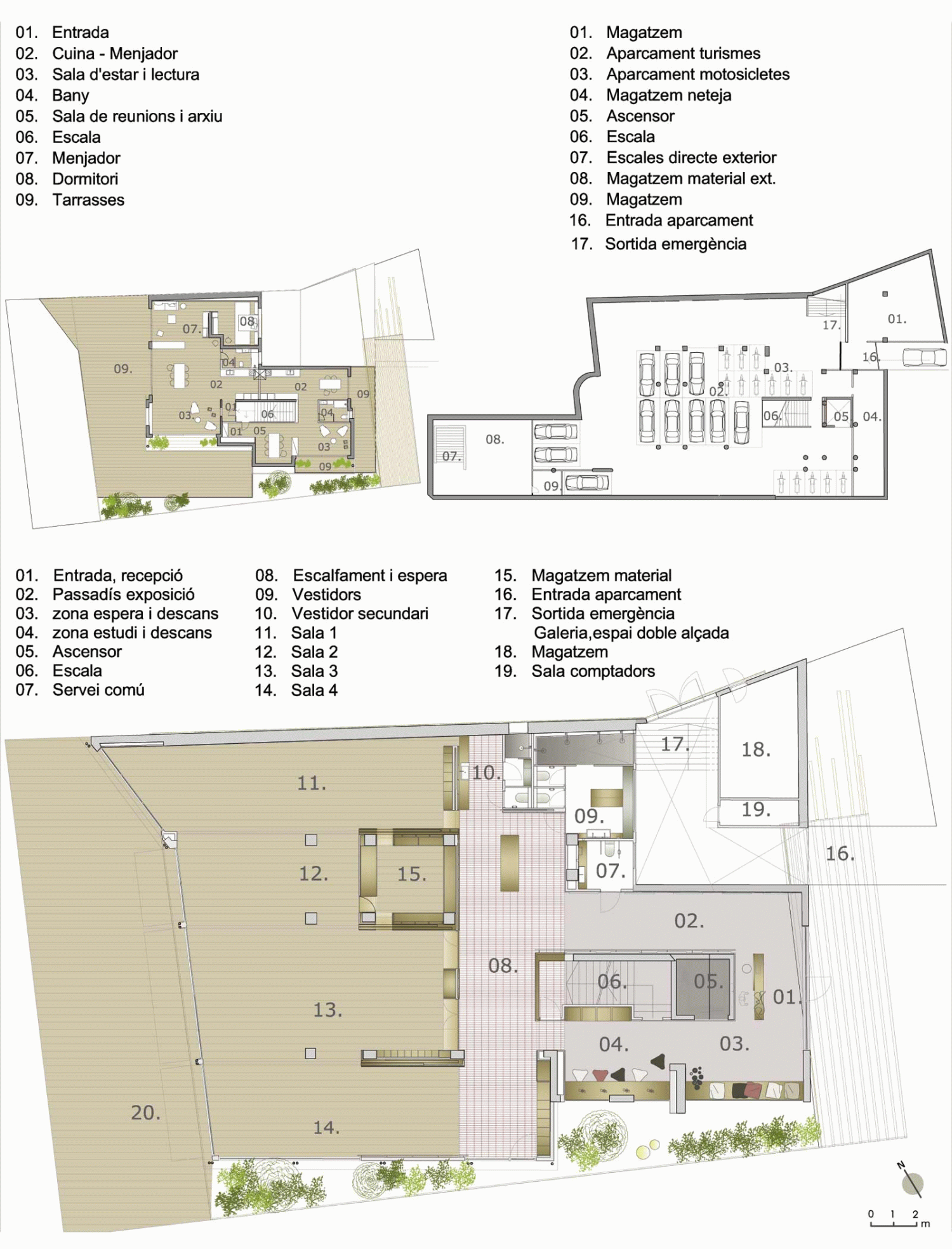El proyecto diseña la escuela en la planta baja y el entorno del edificio. En el sótano y en el primer piso se ha realizado un anteproyecto de aparcamiento, administración y un apartamento anexo.
