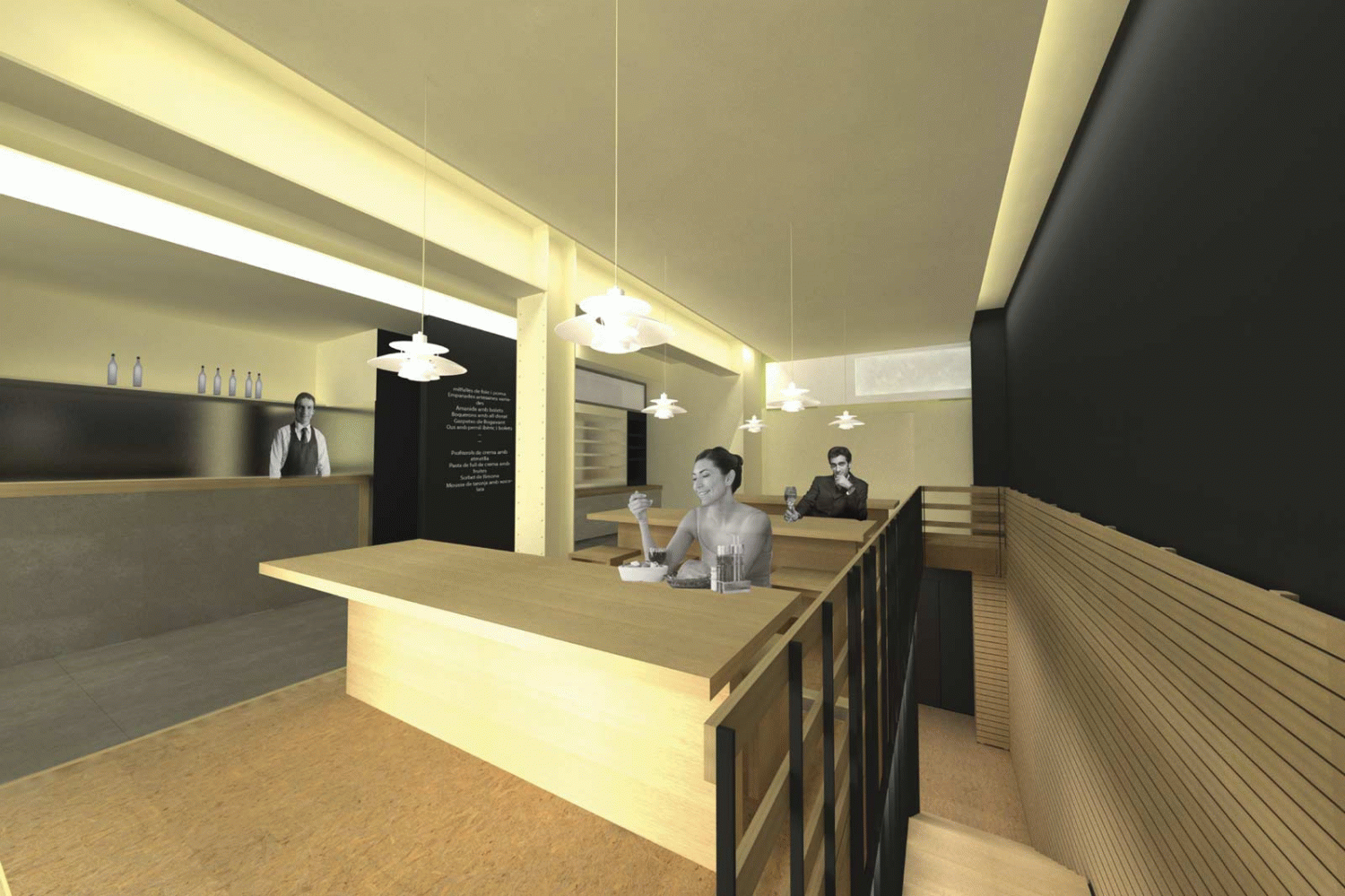 Rehabilitación de un local situado en la calle Calvet de Barcelona para montar un restaurante de cocina rápida de calidad. El local está situado en un edificio del barrio de Sant Gervasi-Galvany de Barcelona. Tiene una superficie total de 153 m2 y consta de dos plantas de forma irregular. Algunas de las dificultades que plantea este proyecto son la falta de luz natural y la ventilación del sótano.