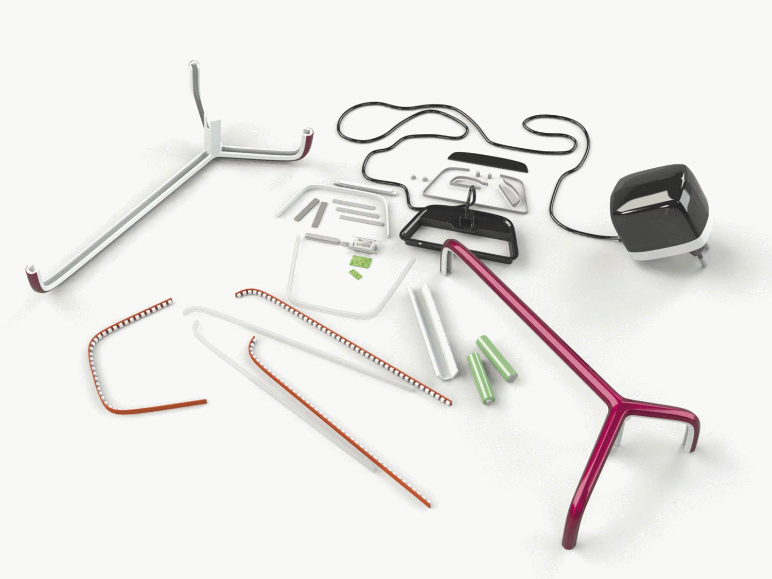 Un solo molde de inyección resuelve las piezas plásticas necesarias para su montaje y la tecnología que incluye permite que se encienda gracias al movimiento. Esta linterna posibilita dos tipos de iluminación, que permiten gozar de la luz más adecuada en cada momento. La esbeltez del objeto es su característica más destacable. El tratamiento cromático genera un contraste que resalta la forma escultórica y sinuosa del diseño.